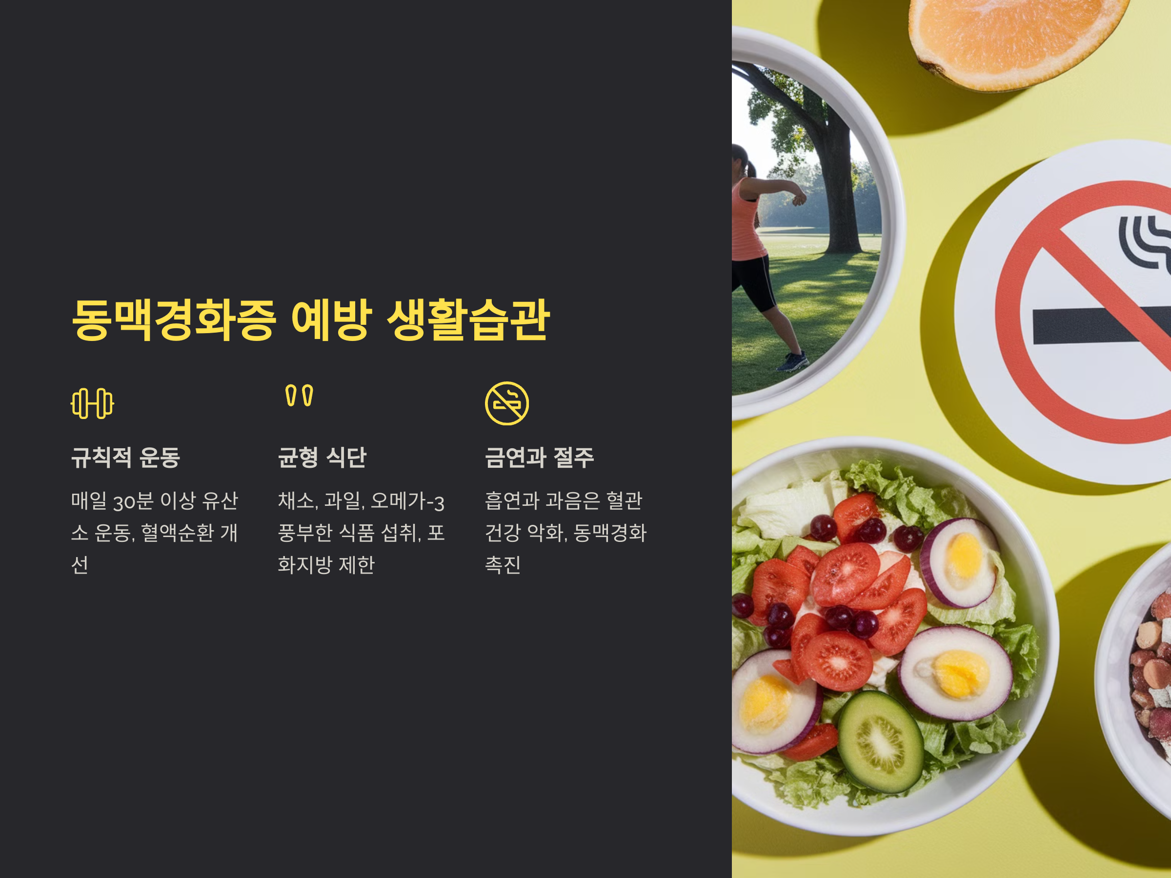 동맥경화증을 예방하기 위해서는 건강한 생활습관이 필수적입니다. 꾸준한 운동과 균형 잡힌 식단은 혈관 건강을 지키는 데 큰 도움이 됩니다. 다음은 동맥경화증 예방을 위한 몇 가지 주요 생활습관입니다.