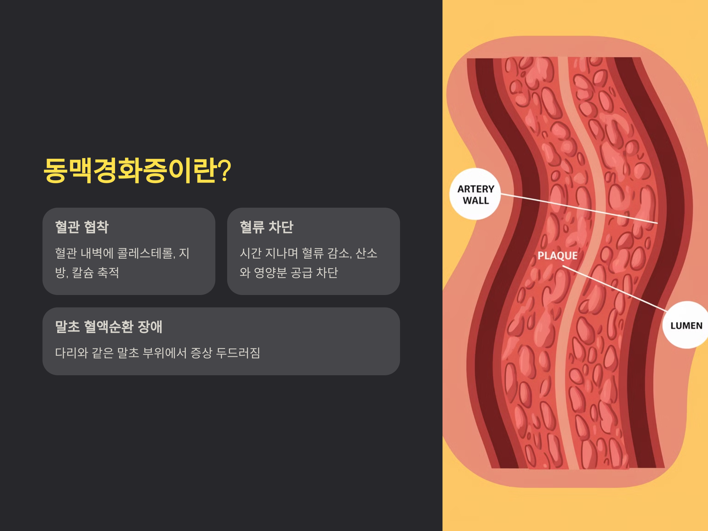 동맥경화증은 초기에는 특별한 증상이 없기 때문에 많은 사람들이 이를 인지하지 못합니다. 하지만 시간이 지나면서 혈액 흐름에 영향을 미치기 시작하고, 다리 저림이나 냉증과 같은 불편함을 느끼게 됩니다. 이러한 증상은 혈액순환이 원활하지 않다는 신호일 수 있기 때문에, 빠른 대처가 필요합니다.