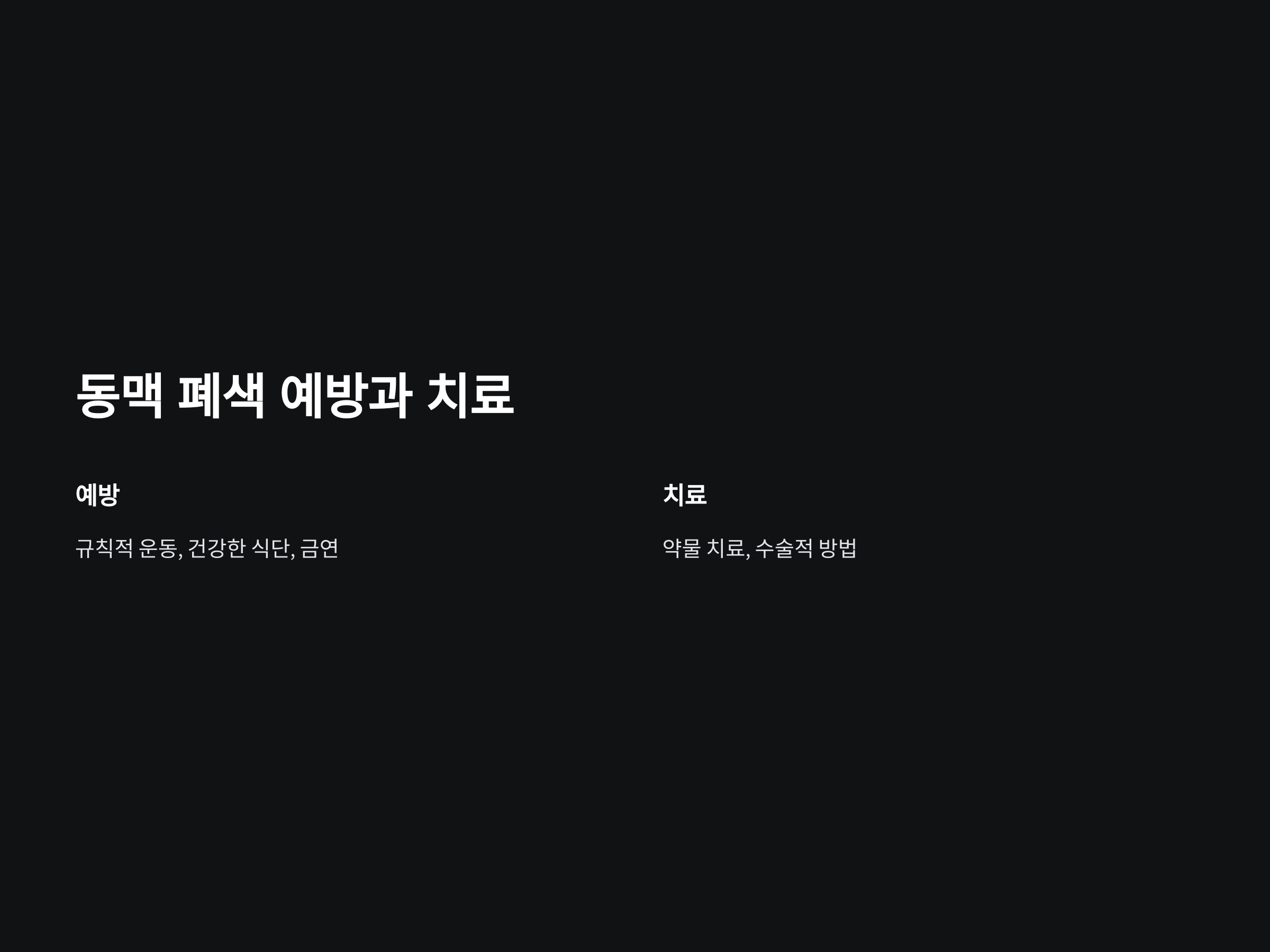 동맥 폐색을 예방하려면, 건강한 생활 습관이 중요합니다. 정기적인 운동, 건강한 식습관, 적정 체중 유지, 금연 등은 동맥 폐색을 예방하는 데 큰 도움이 됩니다. 또한, 고혈압이나 당뇨병이 있는 경우, 이러한 질환을 철저히 관리하는 것이 필요합니다.
