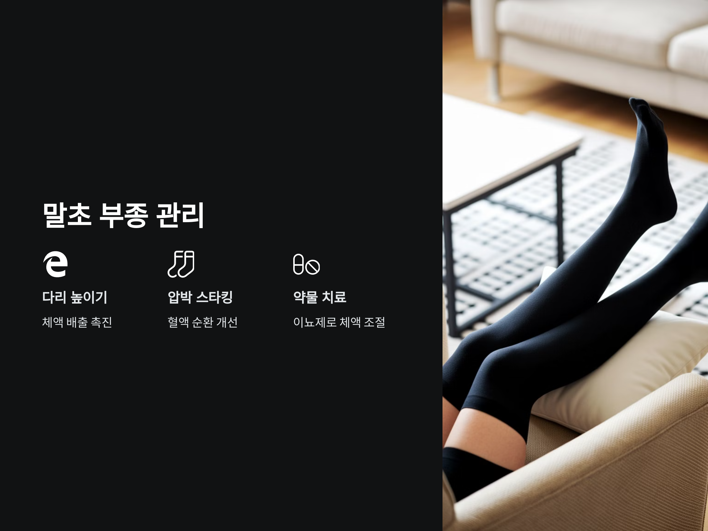 - 압박 스타킹: 다리의 혈액 순환을 돕는 압박 스타킹을 착용하면 부종 예방에 도움이 됩니다.