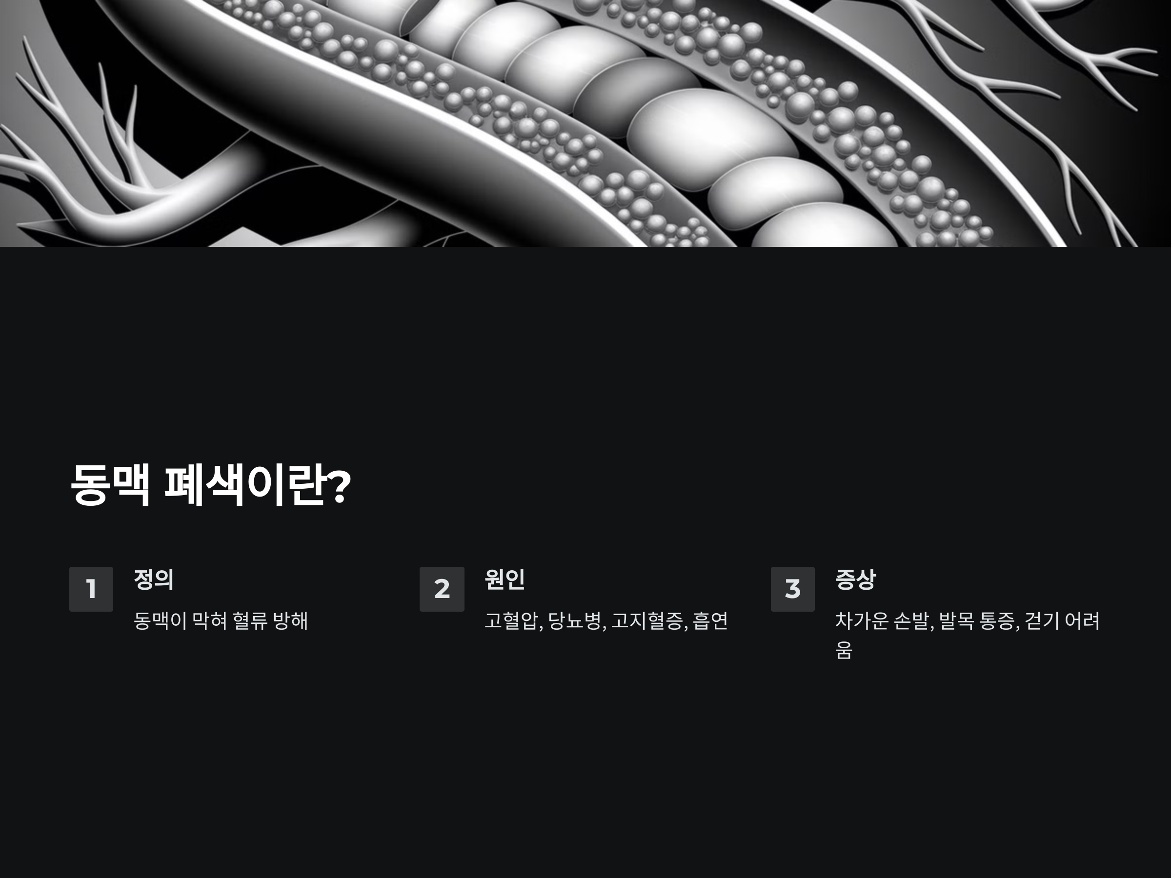 동맥 폐색의 주요 원인에는 고혈압, 당뇨병, 고지혈증, 흡연 등이 있습니다. 이들 질환은 혈관에 손상을 주어 동맥 폐색을 일으킬 수 있습니다. 특히, 발끝과 같은 말초 부위에서 혈액 흐름이 막히면 심각한 부작용이 발생할 수 있습니다. 따라서, 증상을 조기에 인식하고 치료하는 것이 매우 중요합니다.