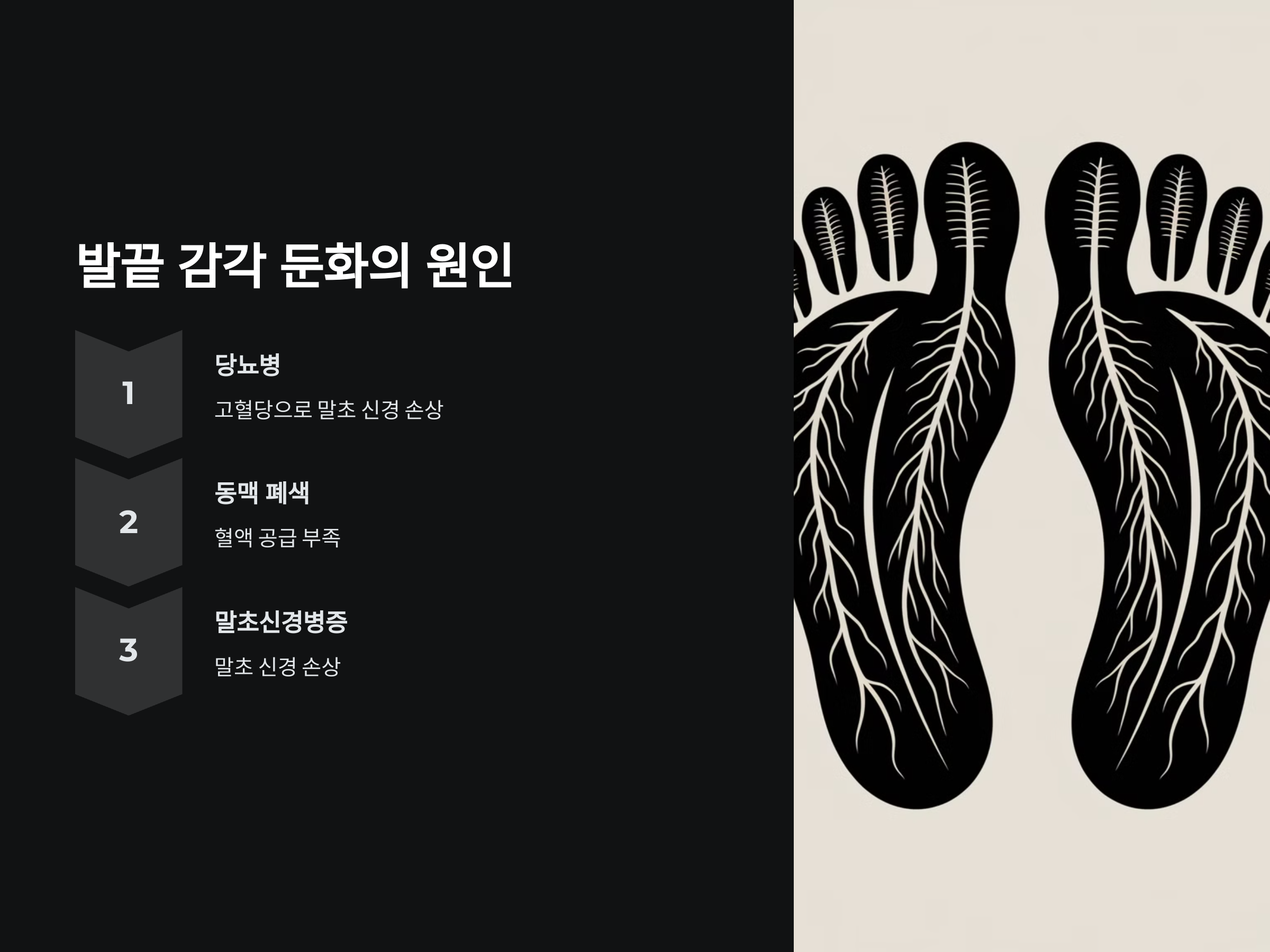 - 동맥 폐색: 동맥이 막혀 혈액 공급이 원활하지 않으면, 발끝에 영양분이 부족해져 감각 둔화가 발생할 수 있습니다.