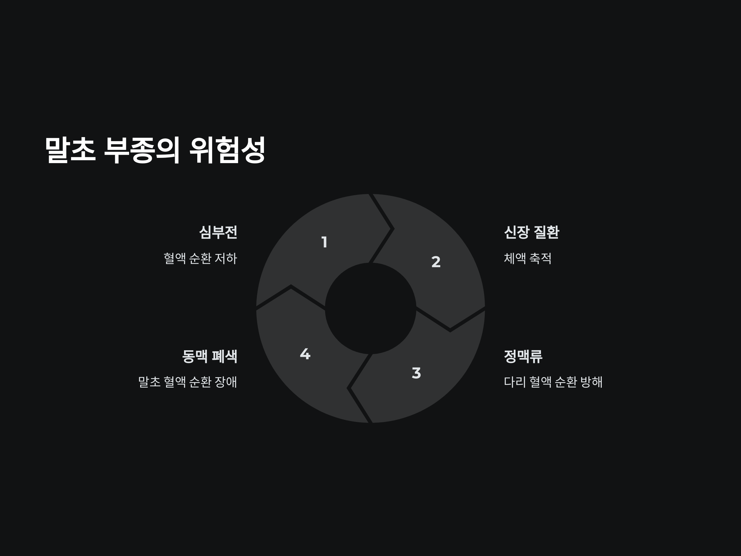 말초 부종은 치료하지 않으면 피부 상태가 악화되고, 장기적인 혈액 순환 장애로 이어질 수 있기 때문에 조기 치료가 필요합니다.