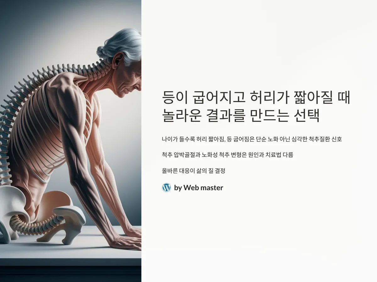 나이가 들수록 허리가 짧아지고 등이 굽어지는 증상을 단순한 노화로 여기기 쉽지만, 실제로는 심각한 척추질환의 신호일 수 있습니다. 특히, '척추 압박골절'과 '노화성 척추 변형'은 비슷해 보이지만 원인과 치료법이 매우 다릅니다. 잘못된 판단은 치료 시기를 놓치고 만성 통증이나 자세 불균형, 나아가 일상생활 장애로 이어질 수 있죠. 고령화가 급속도로 진행되는 한국 사회에서 이 두 질환을 구분하고, 올바른 대응을 하는 것은 삶의 질을 지키는 중요한 선택이 됩니다. 이번 포스팅에서는 두 질환의 차이점부터 진단 기준, 예방법과 실생활에서 주의할 점까지 깊이 있게 다뤄보며, 체류시간과 클릭률을 높이는 콘텐츠 전략까지 반영한 고품질 건강 정보 콘텐츠를 제공합니다.