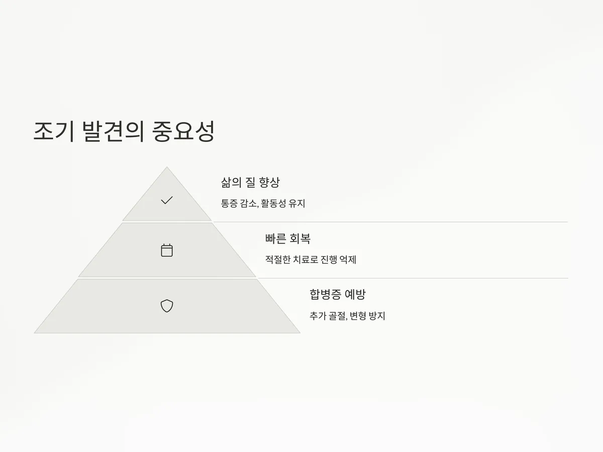 두 질환 모두 조기 예방이 중요하며, 특히 골밀도 관리와 자세 교정이 핵심입니다. 평소 앉거나 서 있는 자세에서 허리를 꼿꼿이 펴고, 무거운 물건을 들 때는 반드시 무릎을 굽혀야 합니다. 또한, 50대 이후에는 정기적인 골밀도 검사와 척추 정밀 검진을 받는 것이 좋습니다.
