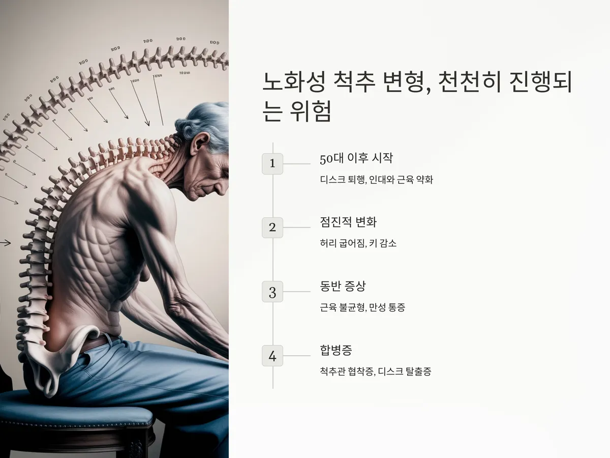 특히, 노화성 변형은 지속적인 근육 불균형과 통증을 동반하며, 일상생활에 큰 불편을 줍니다. 외형적인 변화뿐 아니라 척추관 협착증이나 디스크 탈출증 등과 동반되면서 다양한 신경 증상을 초래하기도 하죠. 문제는 이러한 증상이 단순한 '나이 탓'으로 치부되기 쉽다는 점인데, 조기 발견과 운동·치료를 통한 예방이 중요합니다.