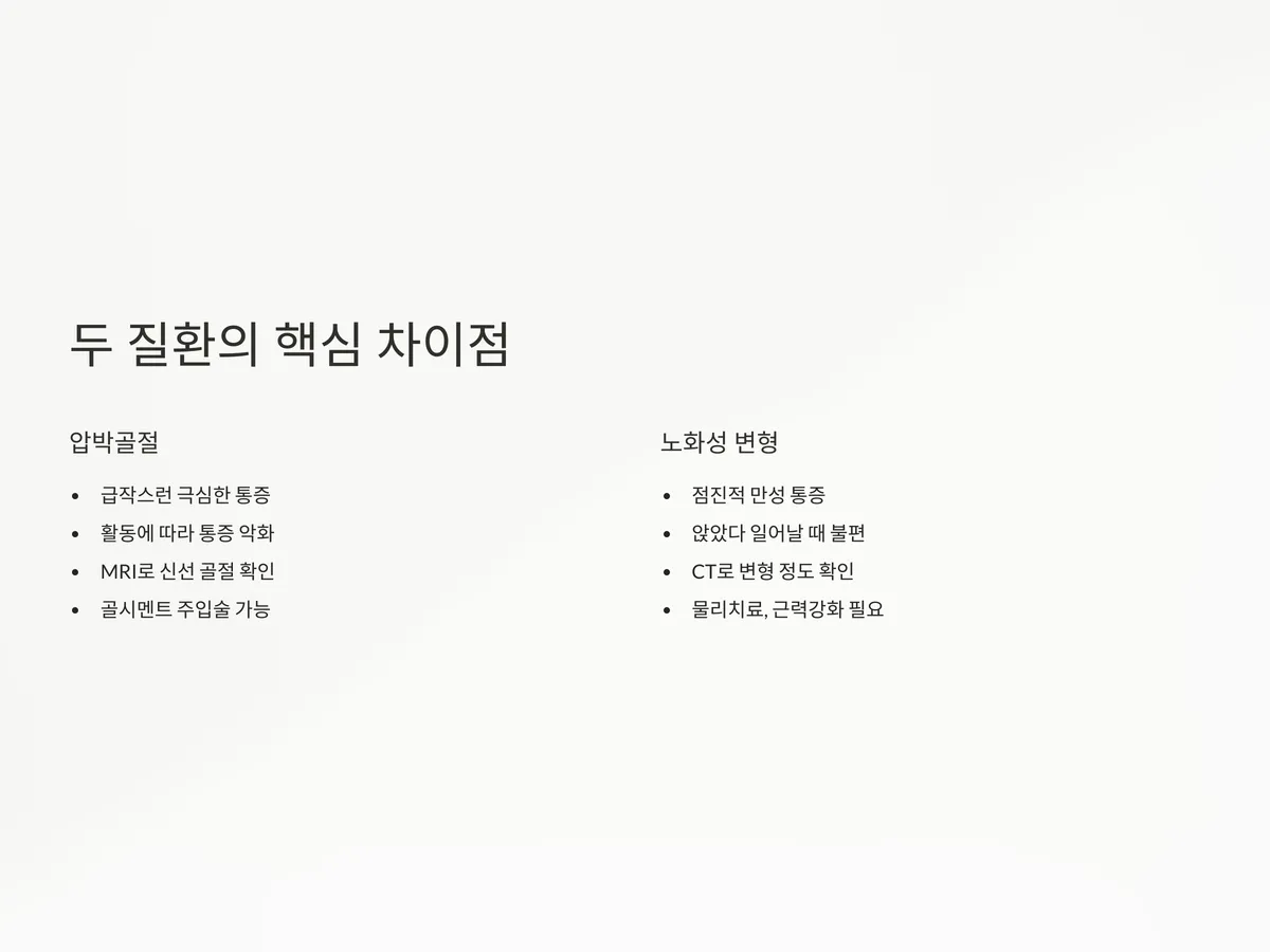 압박골절과 노화성 척추 변형은 증상만 보면 구분하기 어렵지만, 발병 속도와 위치, 통증 양상 등에서 차이를 보입니다. 압박골절은 급작스럽고 극심한 통증이 특징이며, 활동이나 자세 변화에 따라 통증이 악화되곤 합니다. 반면 노화성 변형은 점진적이고 만성적인 통증으로, 특히 앉았다가 일어날 때나 오래 걸었을 때 불편함을 느낍니다.