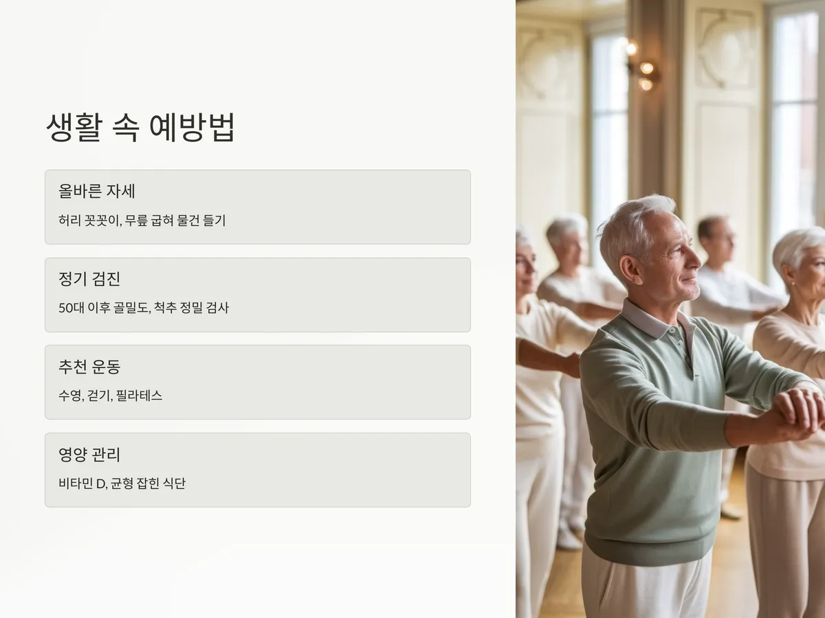 운동은 척추 주변 근육을 강화하는 데 효과적이며, 수영이나 걷기, 필라테스 등이 추천됩니다. 단, 무리한 동작은 오히려 악화시킬 수 있으므로 전문의의 지도를 받는 것이 바람직합니다. 더불어 비타민 D 섭취와 균형 잡힌 식단도 예방에 큰 도움을 줍니다.