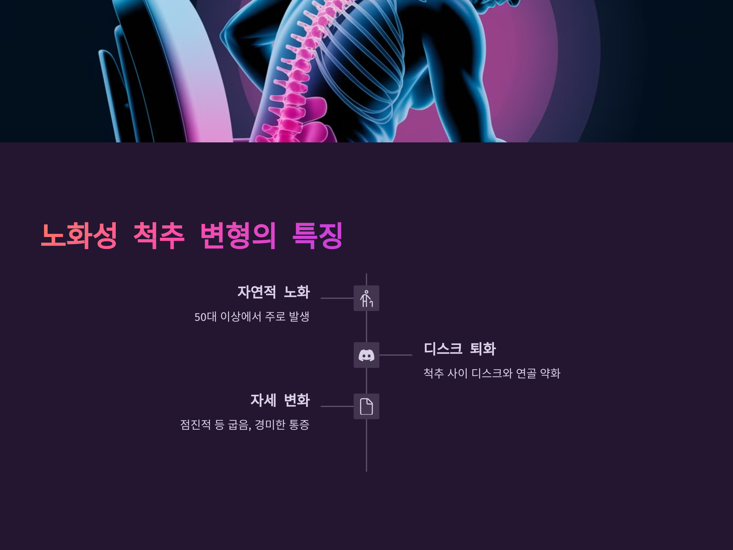 노화성 척추 변형은 나이가 들면서 척추 뼈와 연골이 자연스럽게 퇴화하는 현상입니다. 이 과정에서 척추뼈 사이의 디스크가 퇴화하고, 척추를 지탱하는 연골이 약해지면서 척추의 형태가 변형될 수 있습니다. 주로 50대 이상에서 나타나며, 척추의 퇴화가 진행되면 디스크가 탈출하거나 척추 뼈가 기울어지면서 경미한 허리 굽음이나 등 통증이 발생할 수 있습니다.