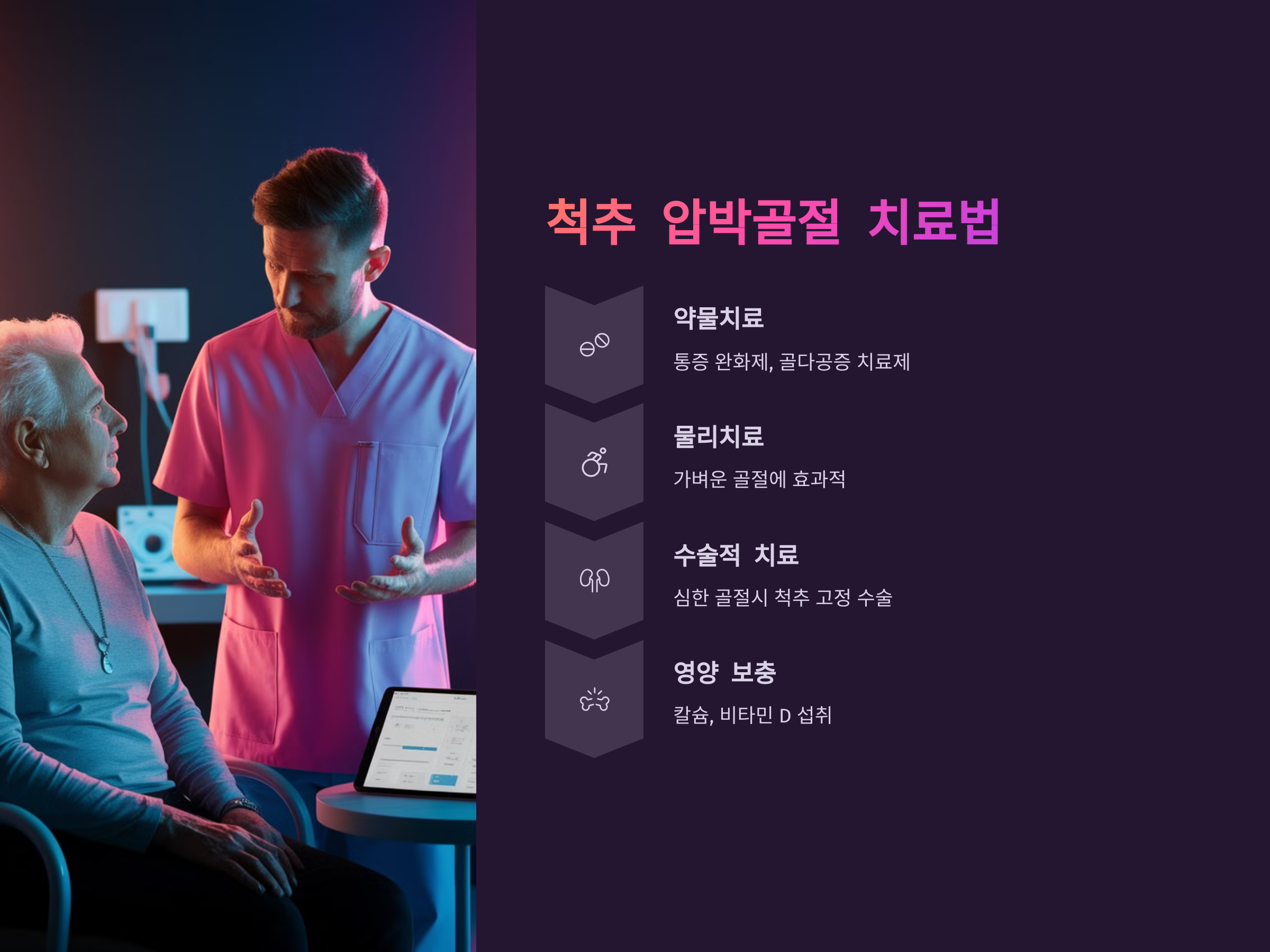 척추 압박골절의 치료 방법은 골절의 정도에 따라 다릅니다. 가벼운 골절일 경우, 물리치료나 약물치료로 증상을 완화할 수 있습니다. 그러나 골절이 심한 경우에는 수술적 치료가 필요할 수 있습니다. 수술 방법으로는 척추 고정 수술이나 척추 골절 복원 수술 등이 있으며, 이는 골절된 척추를 고정시켜 통증을 완화하고, 척추의 정상적인 구조를 복원하는 방법입니다.