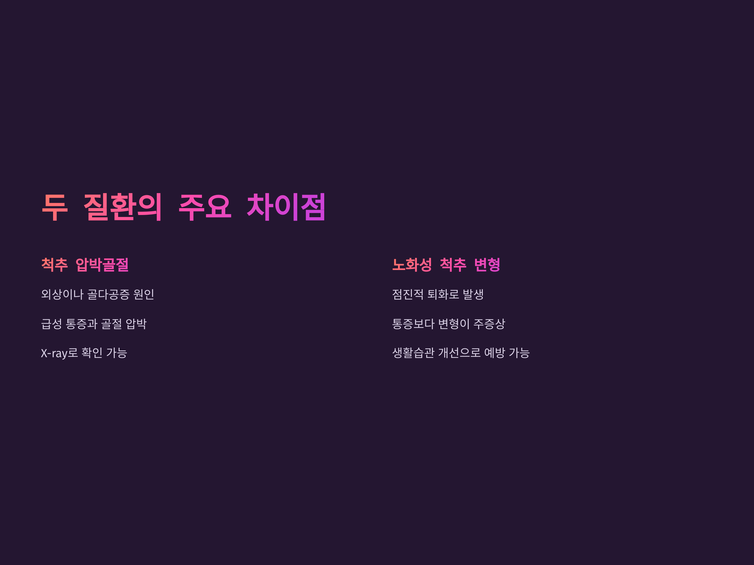 척추 압박골절과 노화성 척추 변형은 증상에서 비슷한 점도 있지만, 원인과 치료 방법에서 큰 차이가 있습니다. 척추 압박골절은 주로 외상이나 골다공증으로 발생하며, 급성 통증과 골절된 부위의 압박이 특징입니다. 반면, 노화성 척추 변형은 점진적인 퇴화로 발생하며, 통증보다는 척추의 변형이 주된 증상입니다.