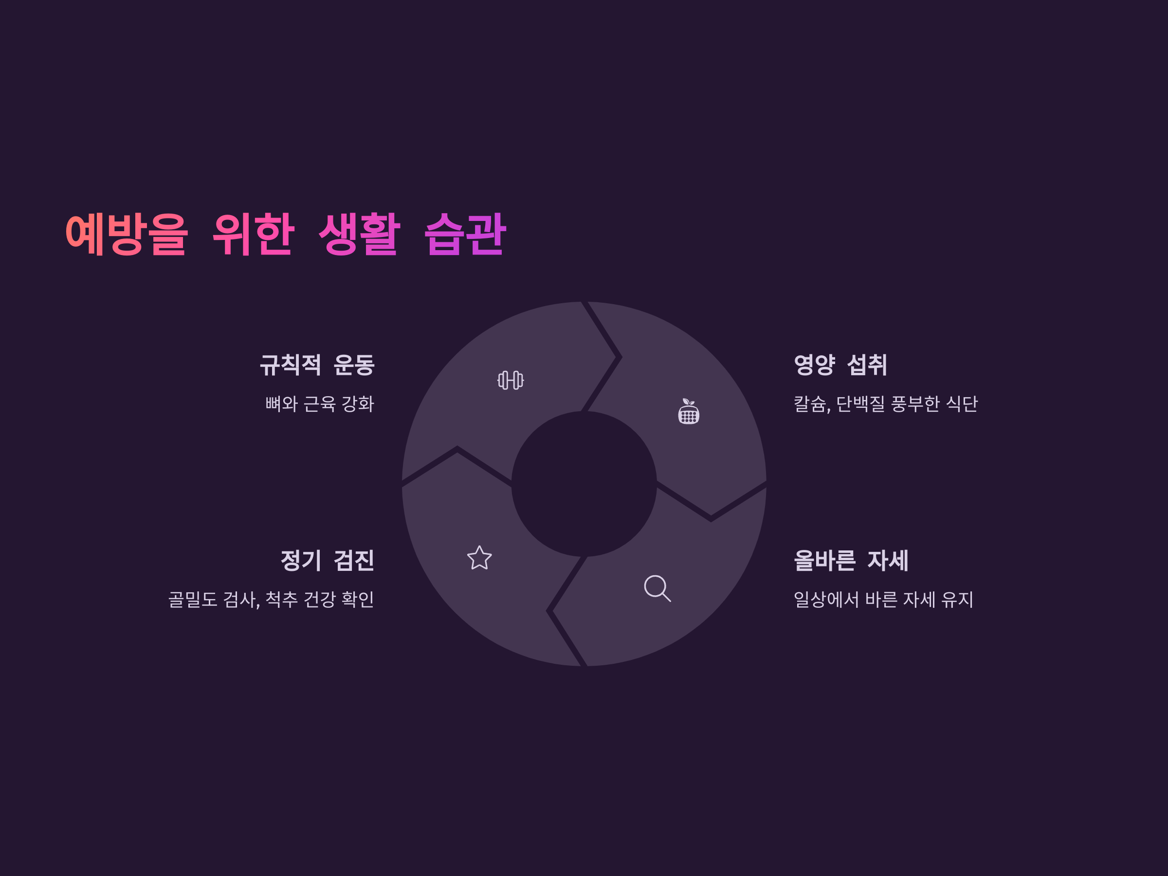 또한, 골다공증 예방을 위한 약물치료가 필요합니다. 골밀도를 유지하기 위한 칼슘과 비타민 D 보충제가 필수적이며, 식이요법과 운동이 병행되어야 합니다. 규칙적인 운동은 뼈를 강화하고, 골다공증을 예방하는 데 중요한 역할을 합니다.