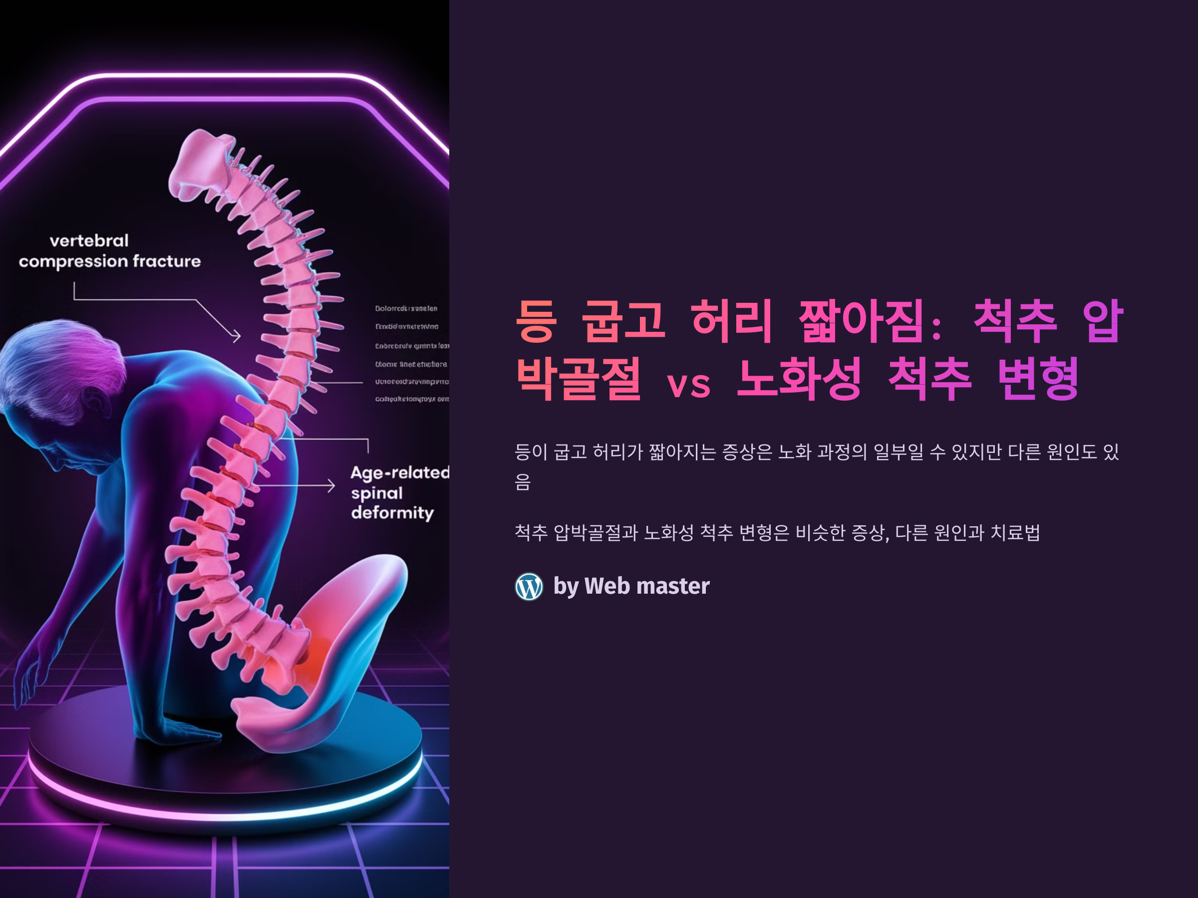 등이 점점 굽고 허리가 짧아지는 증상은 나이가 들면서 많은 사람들이 경험하는 문제입니다. 척추 건강은 시간이 지나면서 자연스럽게 변화하고, 특히 노화가 진행됨에 따라 척추의 구조와 기능이 변화합니다. 하지만 이러한 증상은 단순한 노화로만 설명할 수 없으며, 척추 압박골절이나 노화성 척추 변형 등의 다른 원인도 존재합니다. 이를 정확히 구분하는 것이 중요한데, 이 두 가지는 비슷한 증상을 보일 수 있지만 원인과 치료 방법에서 차이를 보입니다.
