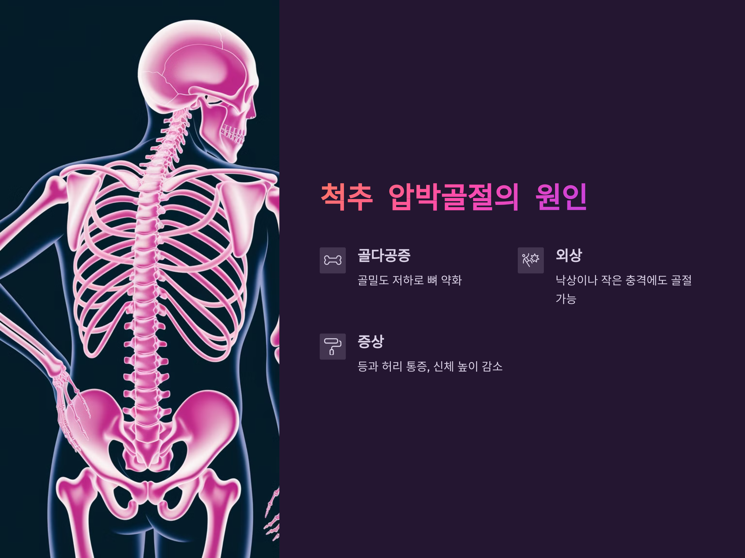 척추 압박골절은 주로 골다공증으로 인해 발생하는데, 골밀도가 낮아지면 뼈가 쉽게 부러지거나 압박을 받게 됩니다. 특히 노인들에게는 더 빈번하게 발생하며, 낙상이나 작은 충격에도 척추가 골절될 수 있습니다. 이 경우, 골절된 척추뼈는 압박을 받아 더 이상 정상적인 높이를 유지하지 못하고 줄어듭니다. 이로 인해 등과 허리가 점점 굽고, 전체적인 신체 높이가 줄어들게 됩니다.