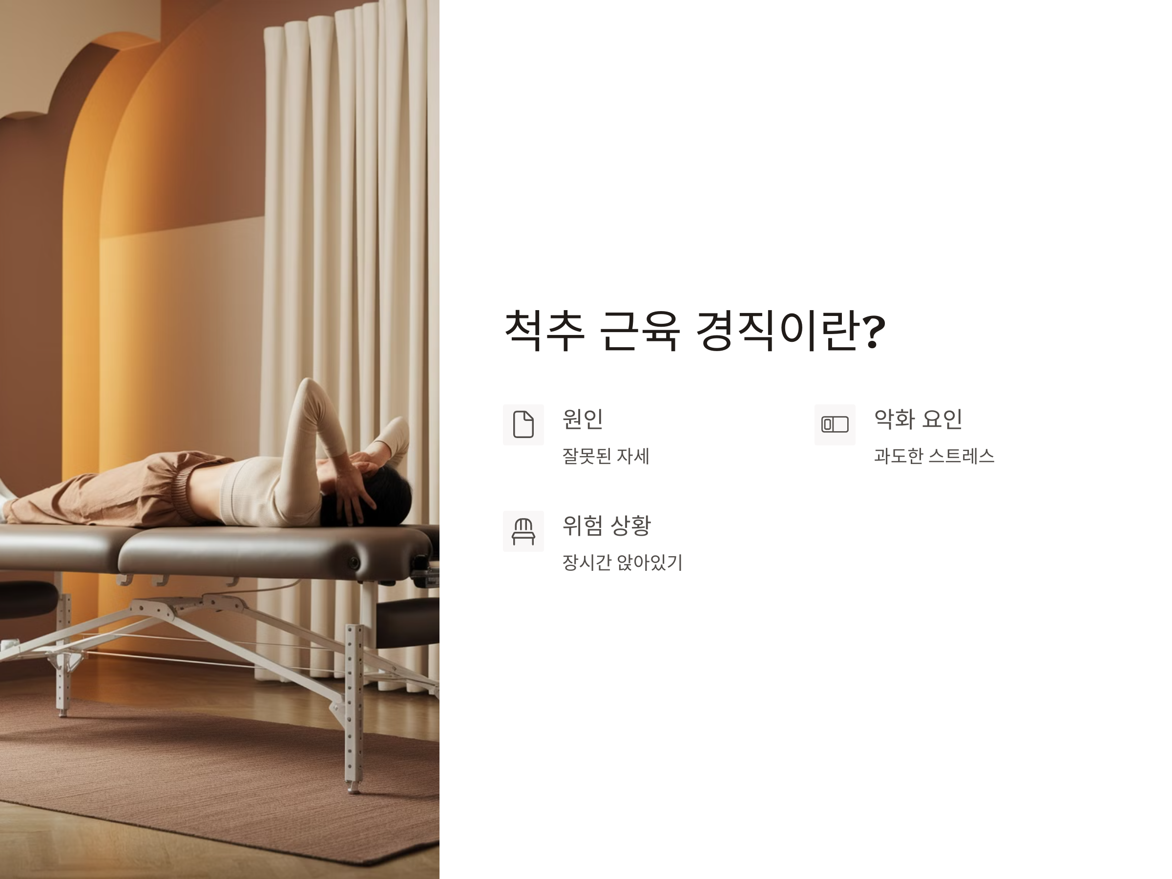 이 경우에는 스트레칭, 물리치료, 근육 이완 운동 등이 도움이 될 수 있습니다. 하지만 만약 증상이 계속되거나 통증이 심해진다면, 전문가의 진료를 받는 것이 좋습니다. 척추 근육 경직은 보통 시간이 지나면 호전되지만, 지속적인 관리가 필요합니다.
