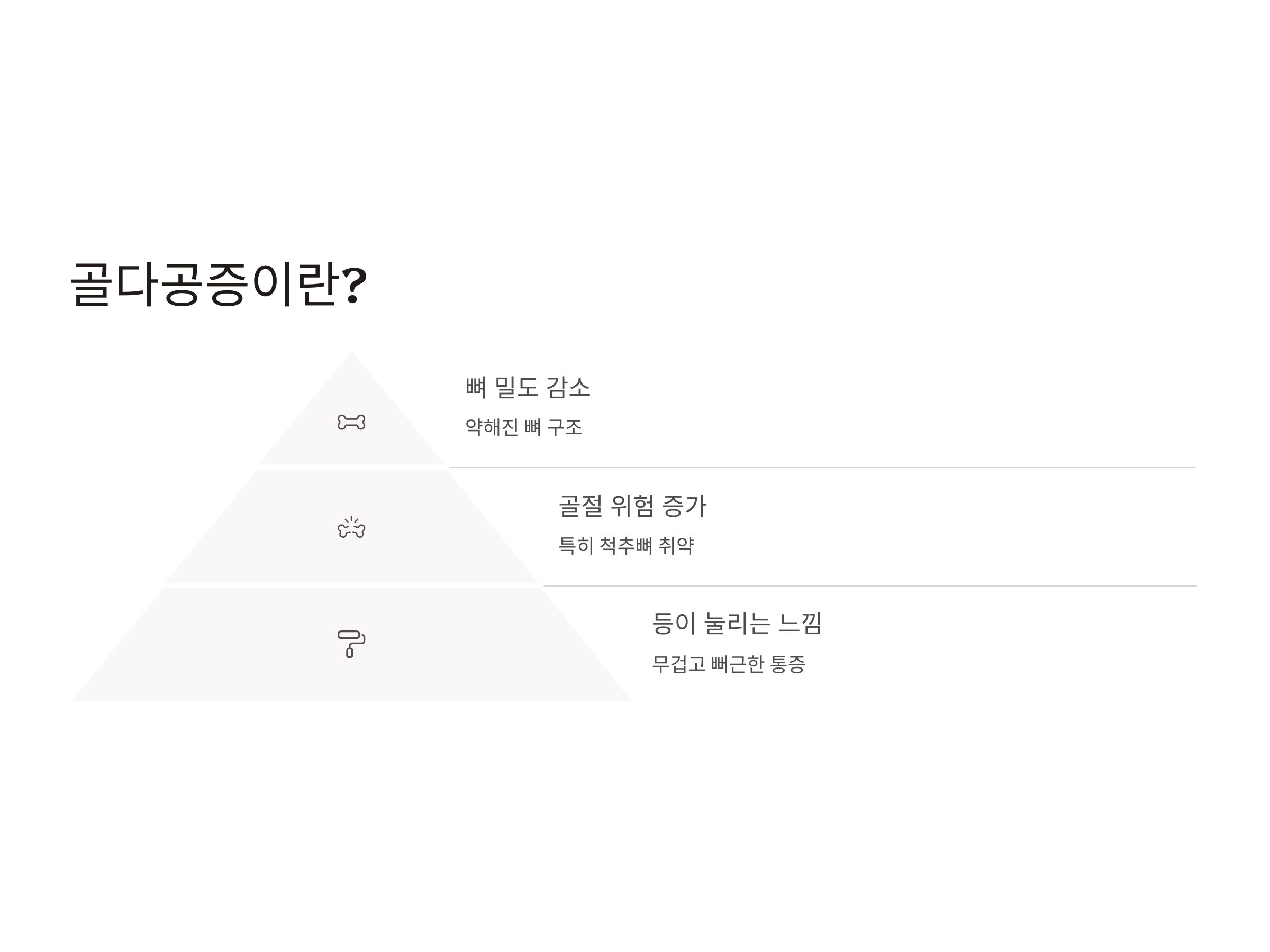골다공증은 뼈의 밀도가 낮아지고, 뼈가 약해져서 쉽게 골절될 수 있는 상태를 말합니다. 골다공증이 진행되면 척추뼈가 특히 약해져서 통증이 발생할 수 있습니다. 초기에는 뼈의 손상이 미미하게 시작되므로 통증을 느끼지 못할 수 있지만, 점차 골절이나 압박 골절이 일어나면서 심한 통증과 불편함을 초래합니다. 특히 척추가 눌리는 느낌을 주기도 하며, "등이 눌리는 느낌"이나 "무겁고 뻐근한 느낌"을 유발할 수 있습니다.
