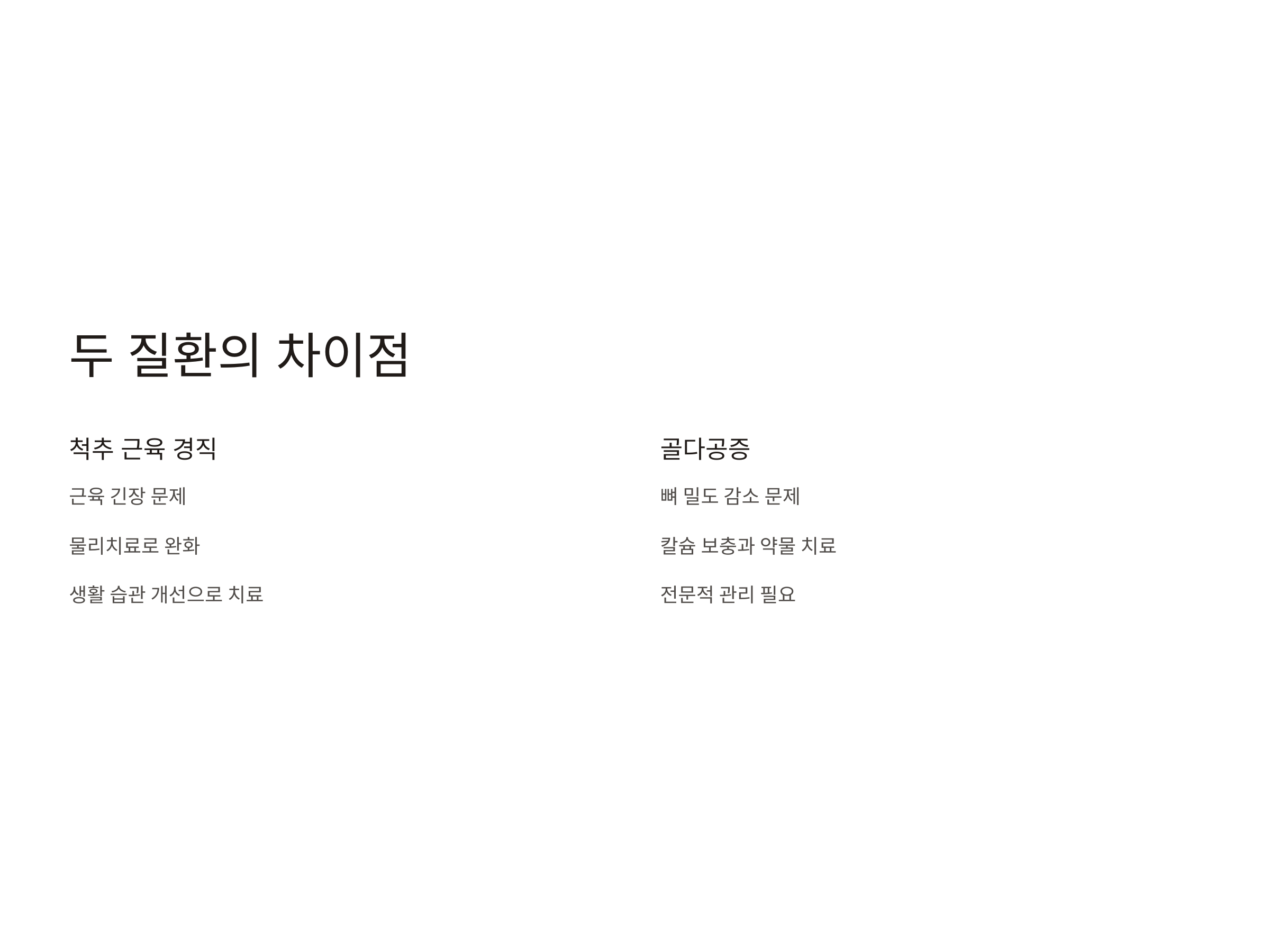 척추 근육 경직과 골다공증은 증상이 유사할 수 있지만, 그 원인과 치료법에서는 뚜렷한 차이가 있습니다. 척추 근육 경직은 근육의 긴장과 관련된 문제로, 보통 물리치료나 스트레칭을 통해 완화할 수 있습니다. 반면 골다공증은 뼈의 밀도 감소로 인한 문제이기 때문에, 칼슘 보충과 약물 치료를 포함한 관리가 필요합니다.