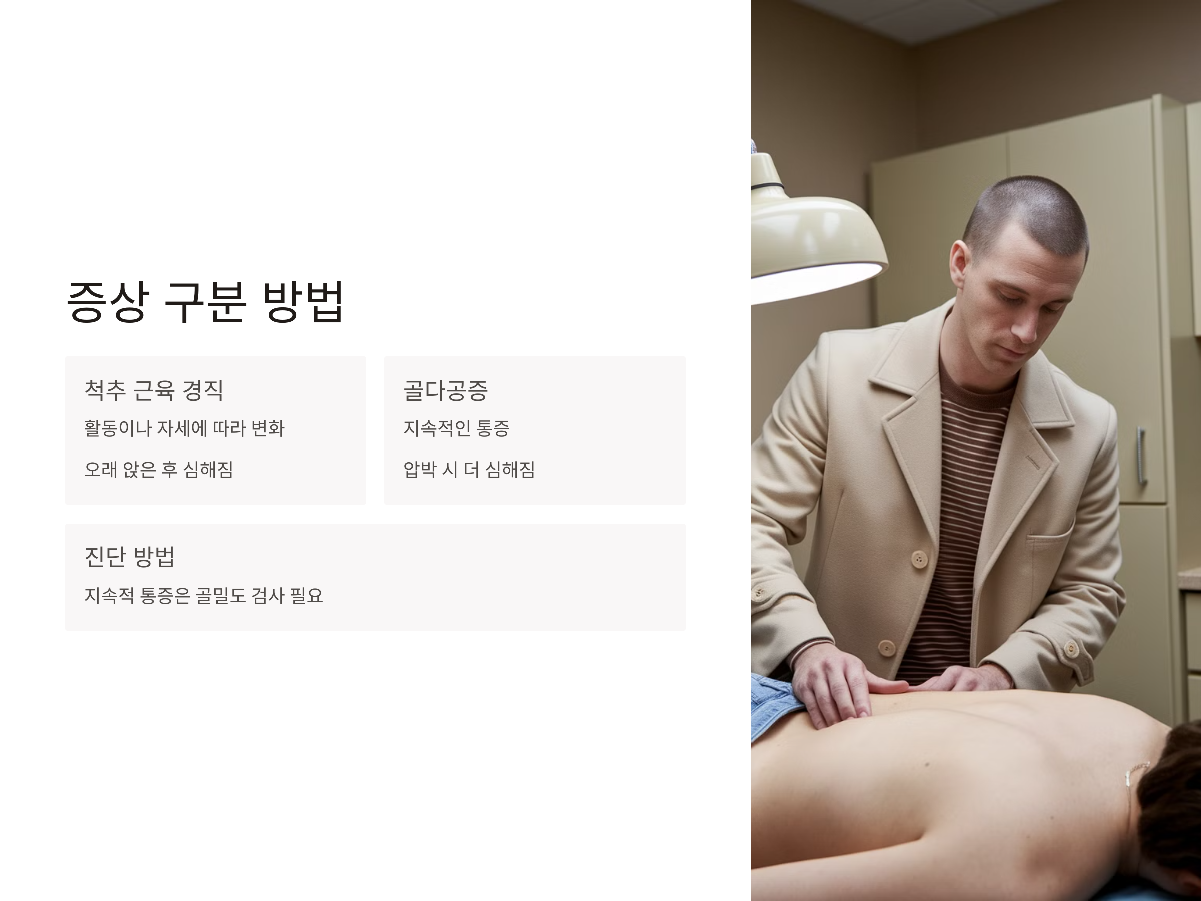 척추 근육 경직과 골다공증의 증상은 비슷하지만, 몇 가지 차이점을 통해 구분할 수 있습니다. 우선, 척추 근육 경직은 활동이나 자세에 따라 증상이 변할 수 있습니다. 예를 들어, 오래 앉아 있거나 비슷한 자세를 유지한 후에 뻐근한 느낌이 심해진다면 척추 근육 경직을 의심할 수 있습니다. 반면, 골다공증으로 인한 통증은 지속적이고, 특히 척추에 압박을 가하는 동작에서 더욱 심하게 느껴집니다. 골절이나 압박 골절이 발생했을 경우에는 갑작스럽고 극심한 통증이 동반될 수 있습니다.