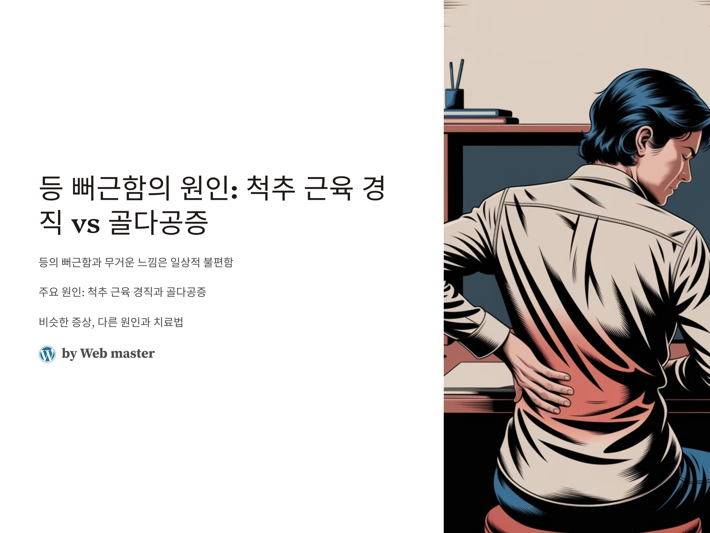 등의 뻐근함과 무겁고 눌리는 느낌은 일상에서 종종 겪는 불편함 중 하나입니다. 이러한 증상은 여러 가지 원인으로 나타날 수 있으며, 그 중에서 척추 근육 경직과 골다공증이 주요한 두 가지 원인으로 꼽힙니다. 이 두 가지는 비슷한 증상을 보일 수 있지만, 근본적인 원인과 치료법에서 큰 차이를 보입니다. 이 글에서는 두 가지 원인의 차이점과 각 증상을 구분하는 방법을 알아보고, 이를 해결할 수 있는 방법에 대해 논의해보겠습니다.