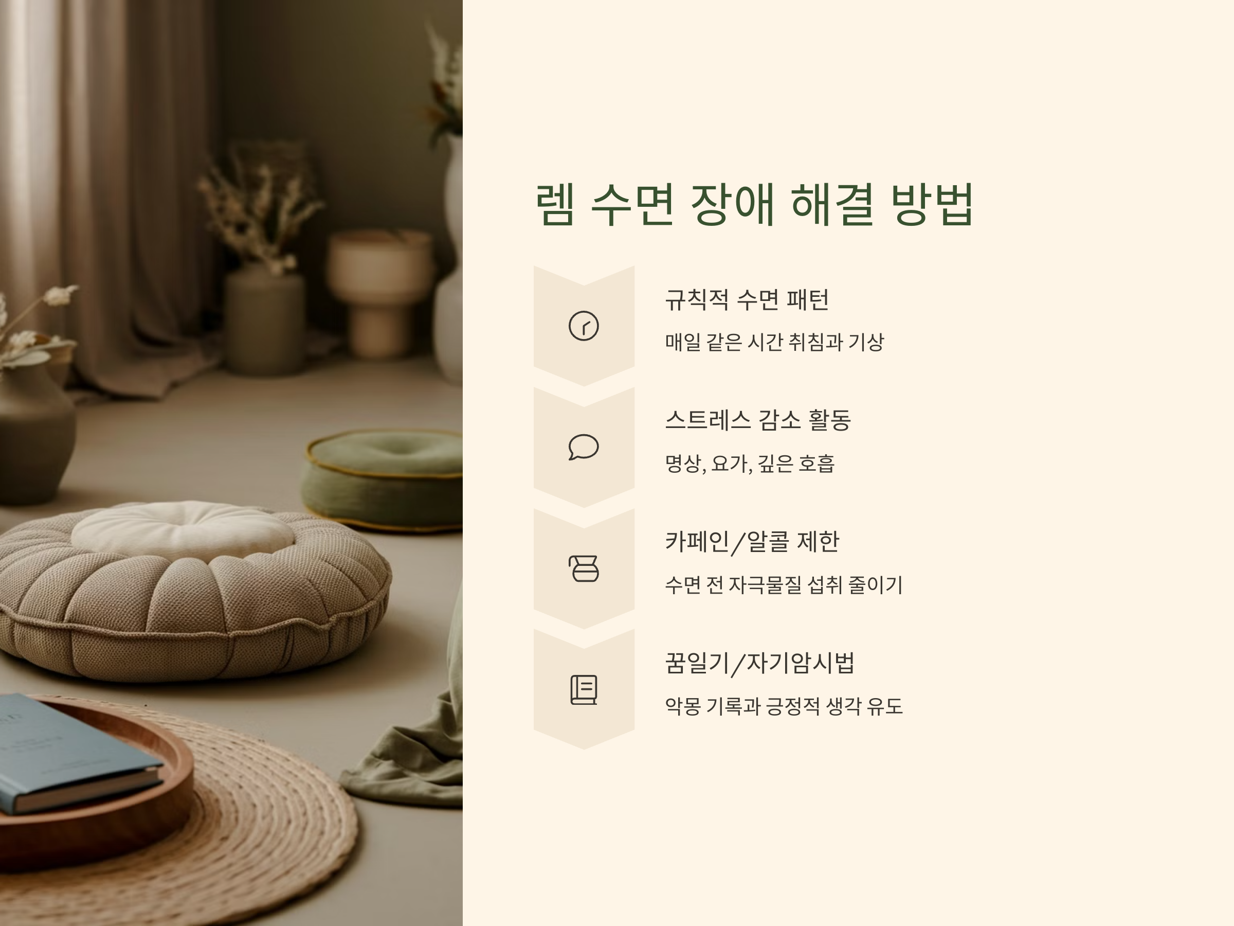 렘 수면 장애와 악몽을 개선하기 위해서는 몇 가지 방법을 실천하는 것이 중요합니다. 첫째, 규칙적인 수면 패턴을 유지하는 것이 필요합니다. 매일 같은 시간에 자고 일어나는 것은 수면의 질을 높이는 데 중요한 역할을 합니다. 또한, 수면 전에는 스트레스를 줄이기 위한 활동을 하는 것이 좋습니다. 명상이나 요가, 깊은 호흡 등은 수면 중 불안을 줄이는 데 도움이 될 수 있습니다.