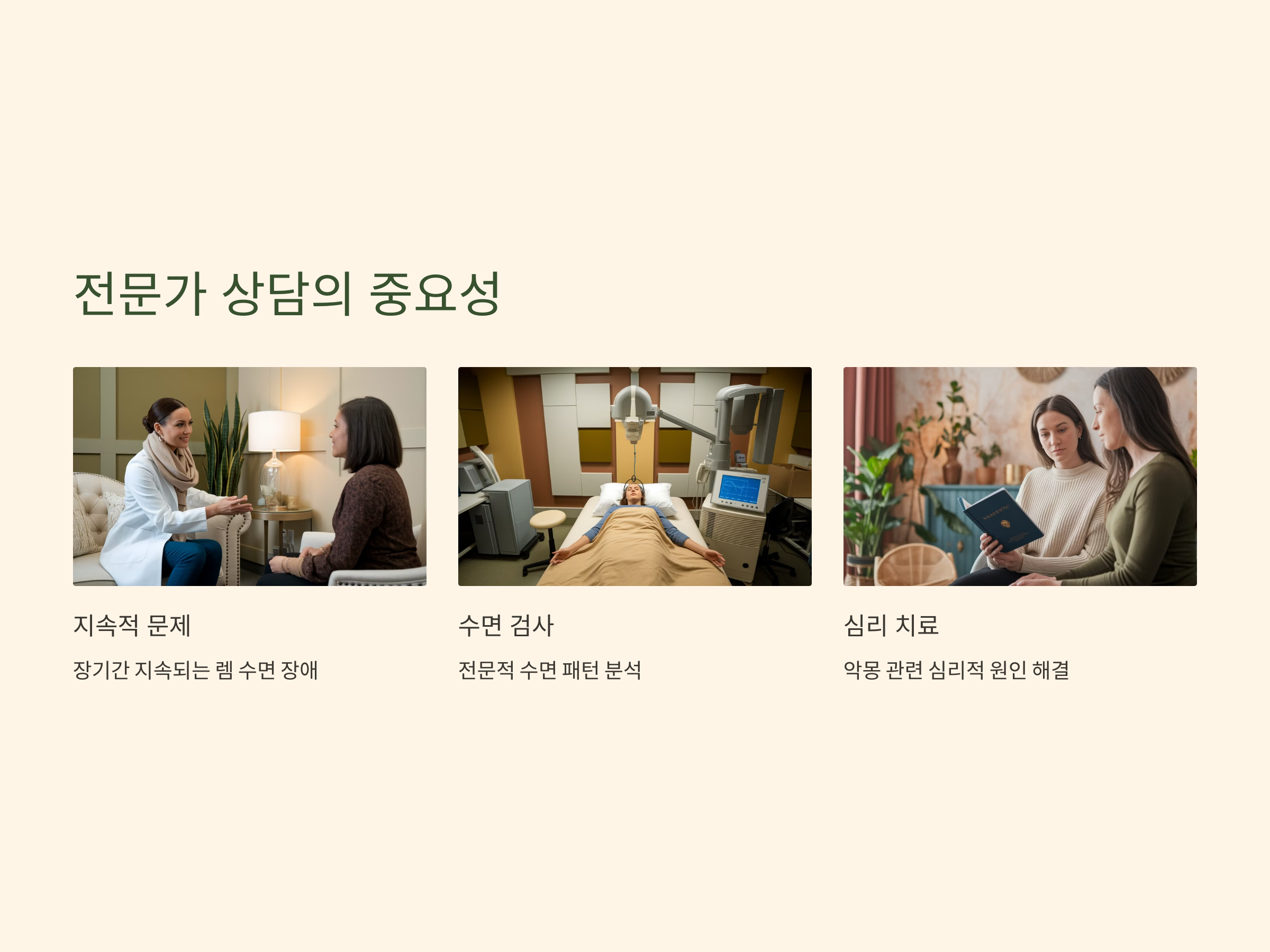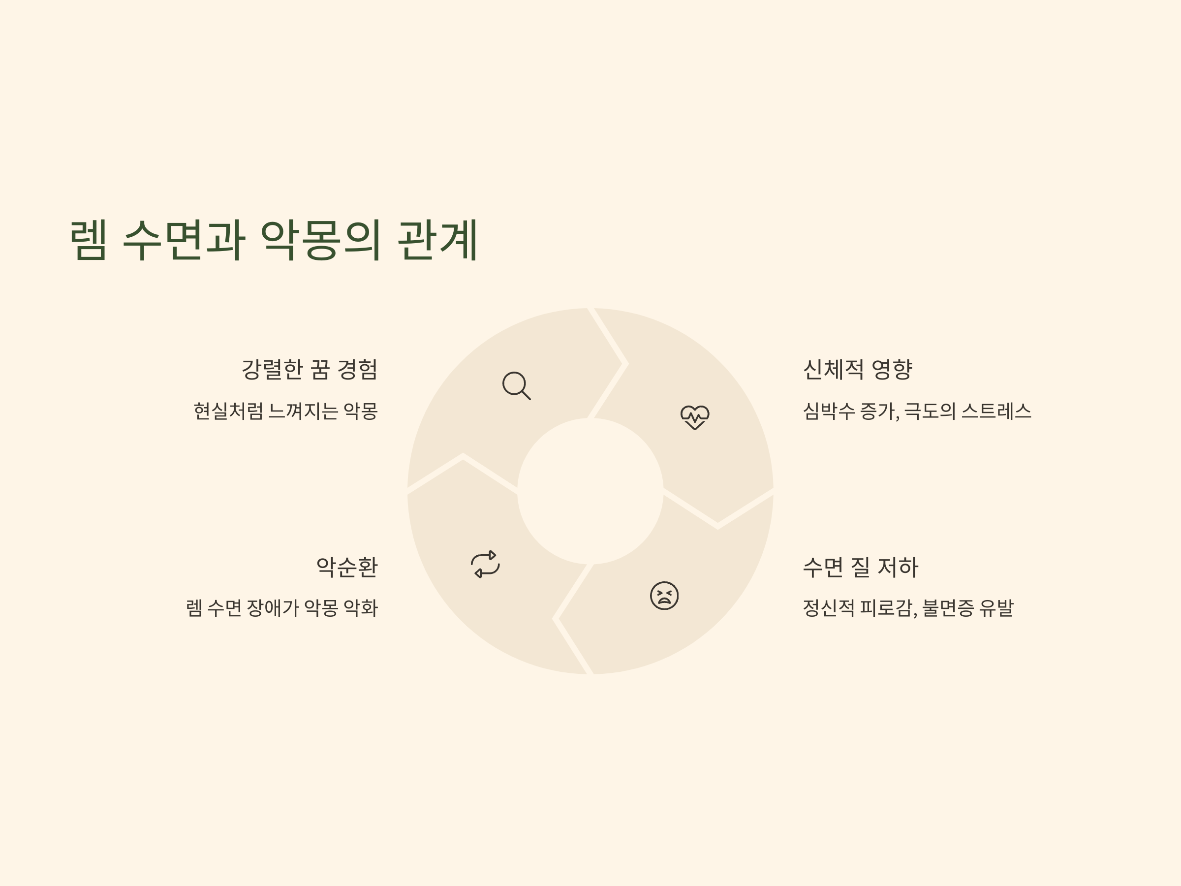 렘 수면 장애는 이러한 악몽을 더욱 악화시킬 수 있습니다. 렘 수면 단계가 불규칙하거나, 꿈의 내용이 매우 공포스러운 경우, 악몽을 자주 꾸는 경향이 있습니다. 이는 정신적인 피로감을 더하고, 불면증을 유발하며, 전반적인 수면의 질을 저하시킬 수 있습니다.