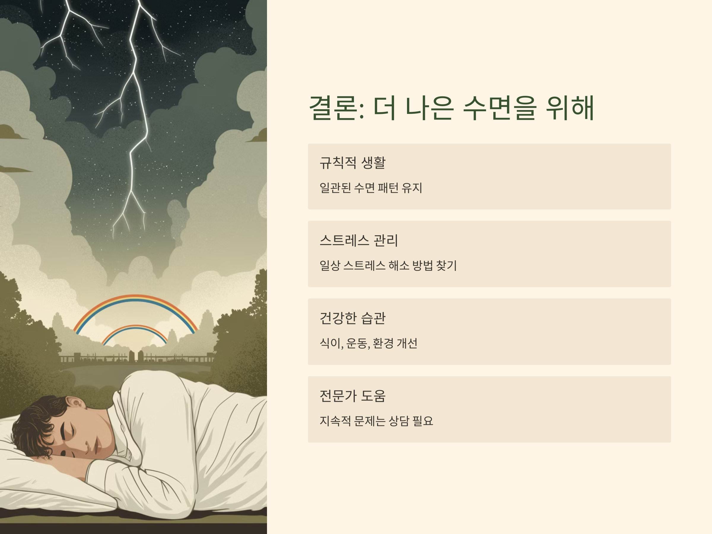 렘 수면 장애와 악몽의 증가는 단순한 불면증을 넘어서, 우리의 건강과 삶의 질에 큰 영향을 미칠 수 있습니다. 이를 해결하기 위해서는 규칙적인 수면 습관, 스트레스 관리, 건강한 생활 습관 등이 필요합니다. 또한, 수면에 영향을 미치는 다양한 외부 요인들을 고려하여, 이를 개선할 방법을 찾는 것이 중요합니다. 만약 렘 수면 장애와 악몽이 지속된다면, 전문가의 상담을 받는 것도 좋은 방법이 될 수 있습니다.