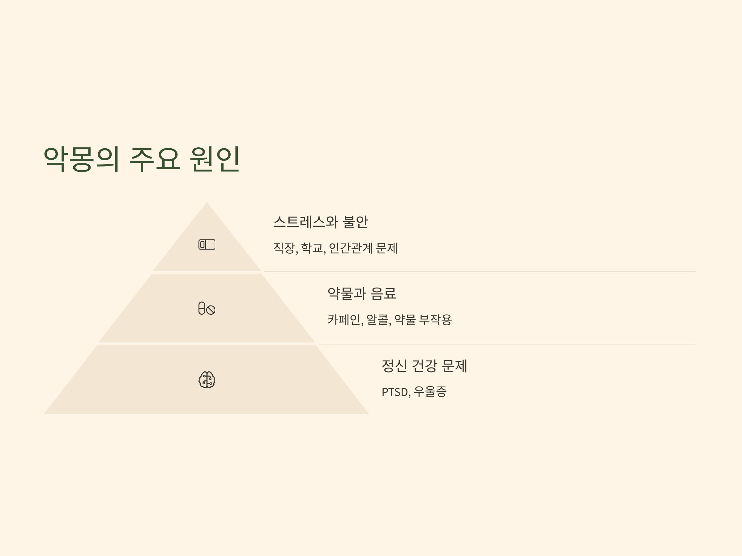 악몽의 원인은 다양하지만, 그 중 가장 큰 영향을 미치는 요소 중 하나는 스트레스입니다. 스트레스가 쌓이면 몸은 이를 해소하려고 다양한 방법으로 반응하는데, 그 중 하나가 수면 중 나타나는 악몽입니다. 또한, 카페인, 알콜, 약물 등의 섭취도 렘 수면 장애를 유발하고 악몽을 자주 꾸게 만드는 원인이 될 수 있습니다. 이에 따라 건강한 수면을 위한 생활 습관의 변화가 필요합니다.