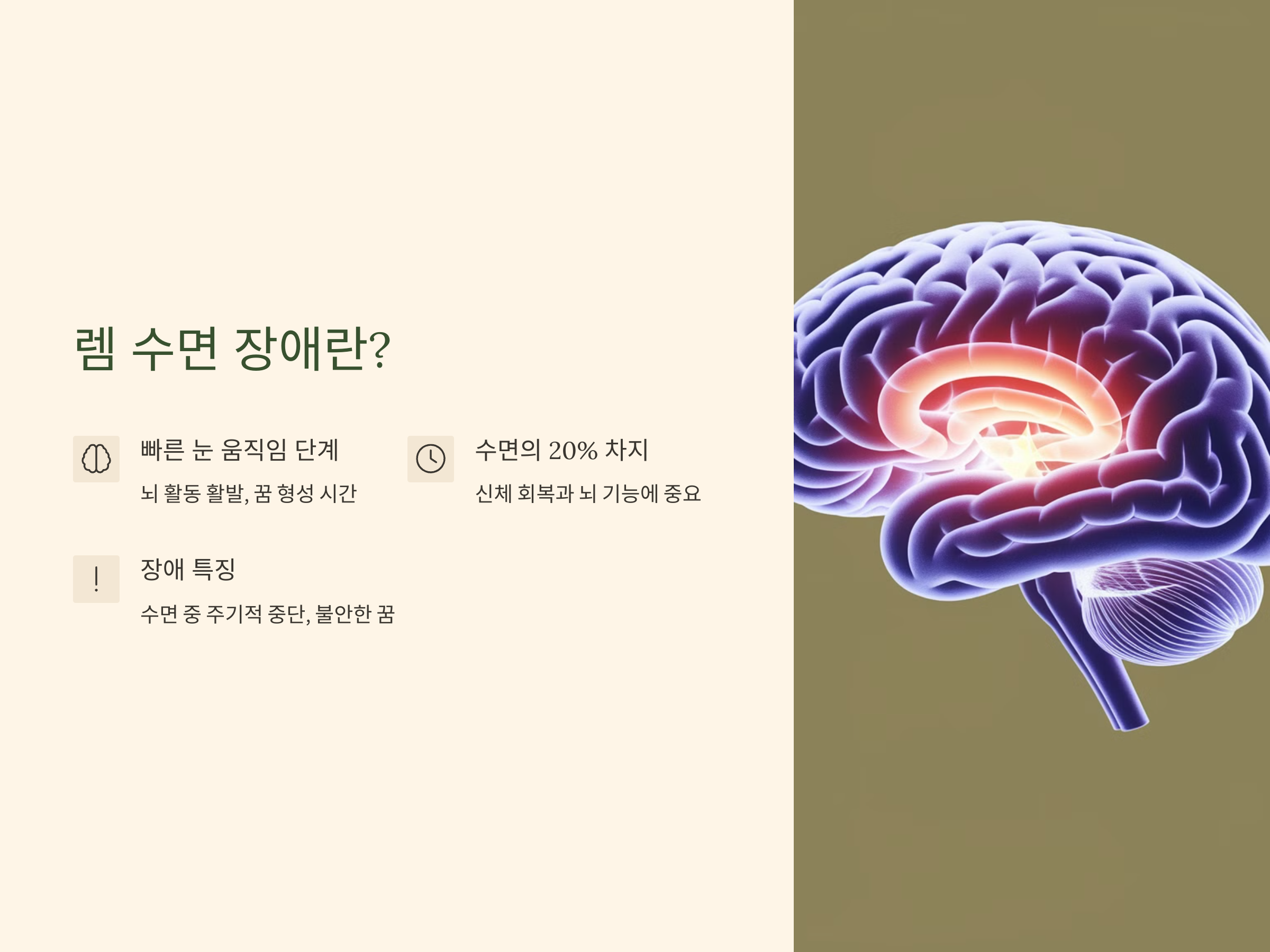 렘 수면 장애는 수면 중 주기적인 중단이나 이상 패턴을 말합니다. 이 장애는 수면 중 꿈을 꾸는 시간대에 일어나며, 꿈의 내용이 불안하거나 폭력적인 경우가 많습니다. 이로 인해 악몽을 자주 꾸거나, 중간에 깨는 일이 많아져 수면의 질이 크게 저하될 수 있습니다. 렘 수면 장애는 때로는 정신 건강 문제와도 연결될 수 있습니다.