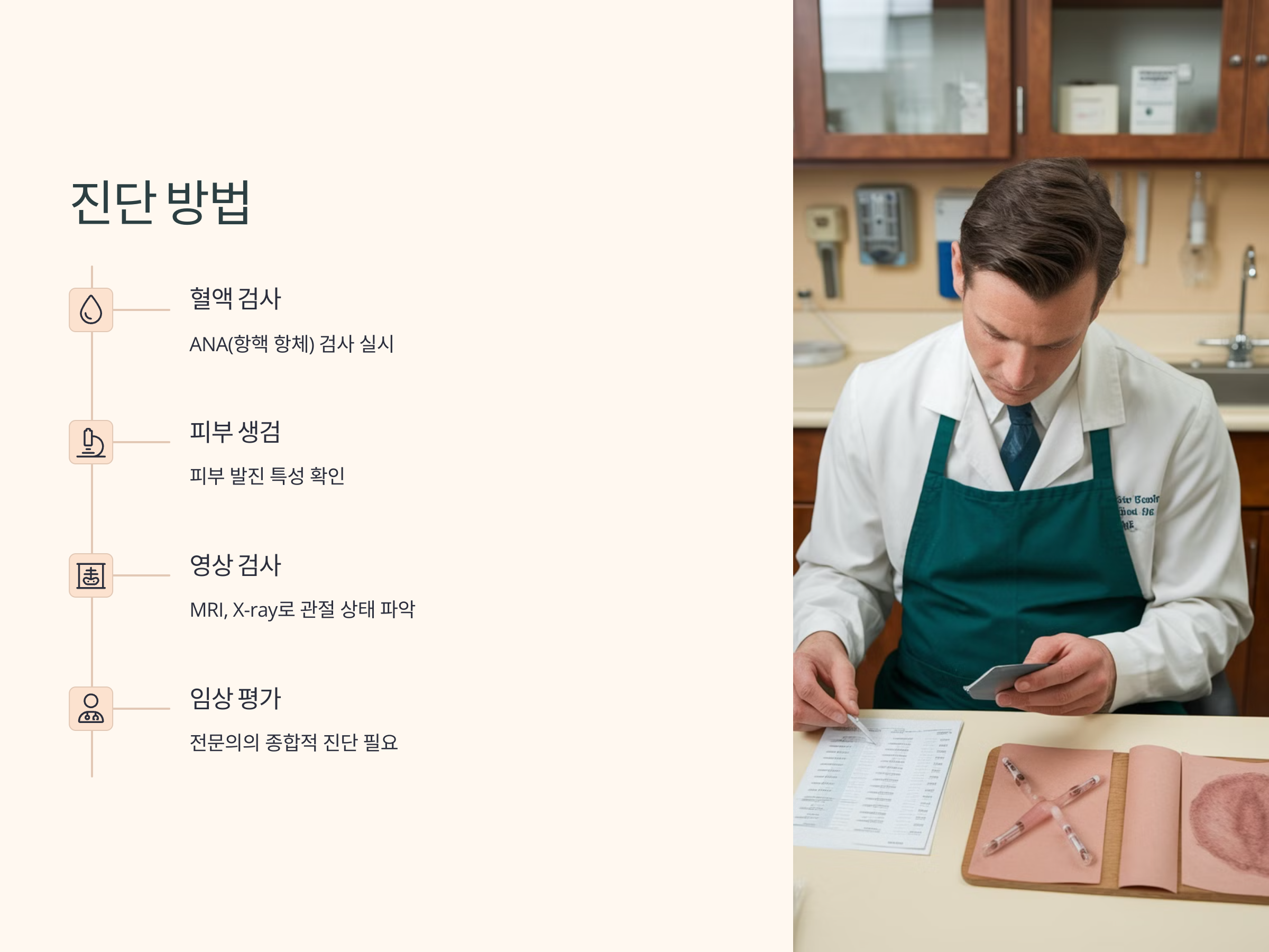 또한, 피부 생검을 통해 피부 발진의 특성을 확인하거나, 염증이 있는 관절에서 MRI나 X-ray를 촬영하여 관절의 상태를 파악하기도 합니다. 이 모든 과정은 전문가의 진단을 필요로 하므로, 루푸스 홍반이 의심된다면 조기에 전문 병원을 방문하는 것이 중요합니다.