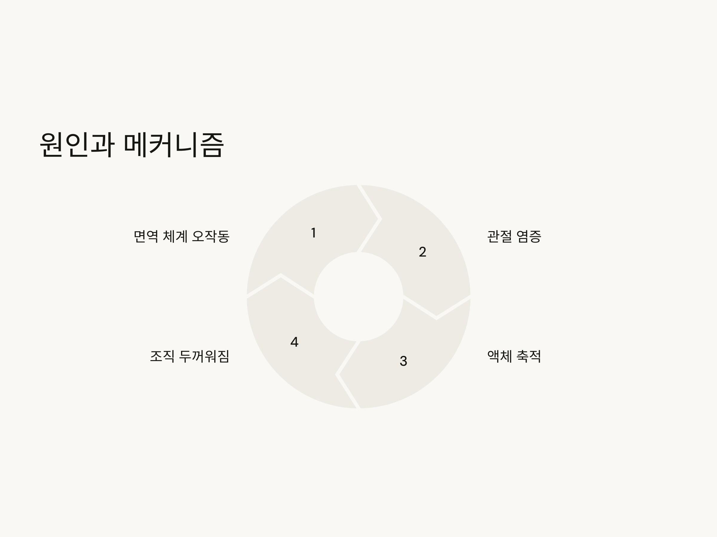 염증은 손가락 관절뿐만 아니라 인대와 힘줄에도 영향을 미쳐, 손의 기능을 제한하는 원인이 됩니다. 염증이 지속되면 관절을 구성하는 연골이 점차 파괴되고, 이는 관절 변형을 유발할 수 있습니다. 초기에는 가벼운 붓기와 뻣뻣함으로 시작하지만, 점차적으로 심각한 통증과 변형을 초래할 수 있습니다.