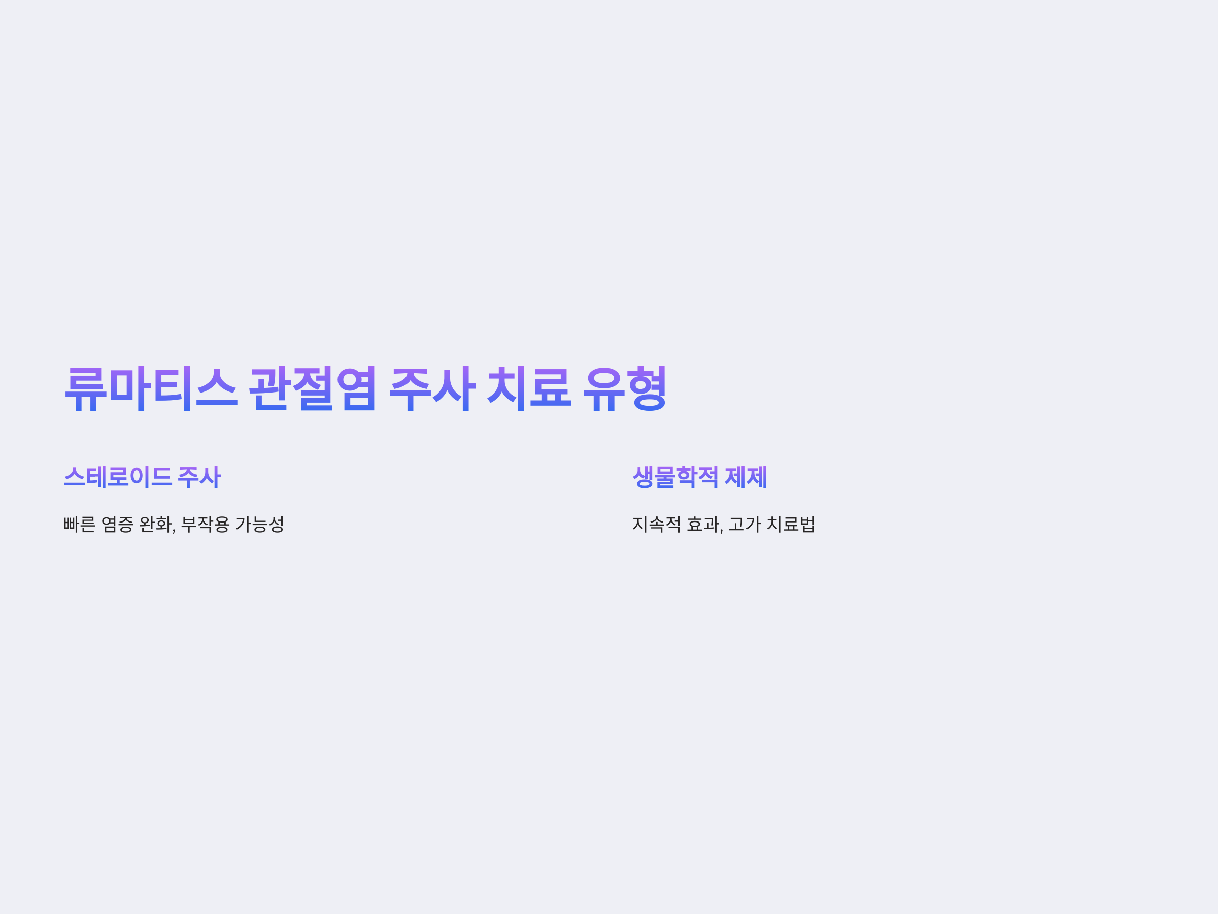 류마티스 관절염의 주사 치료는 주로 두 가지 유형으로 나눌 수 있습니다. 첫 번째는 염증을 줄이고 증상을 완화시키는 스테로이드 주사이며, 두 번째는 생물학적 제제 주사입니다. 생물학적 제제는 염증을 일으키는 특정 분자를 차단하여 증상을 개선하는 방법으로, 류마티스 관절염의 효과적인 치료법으로 인식되고 있습니다.