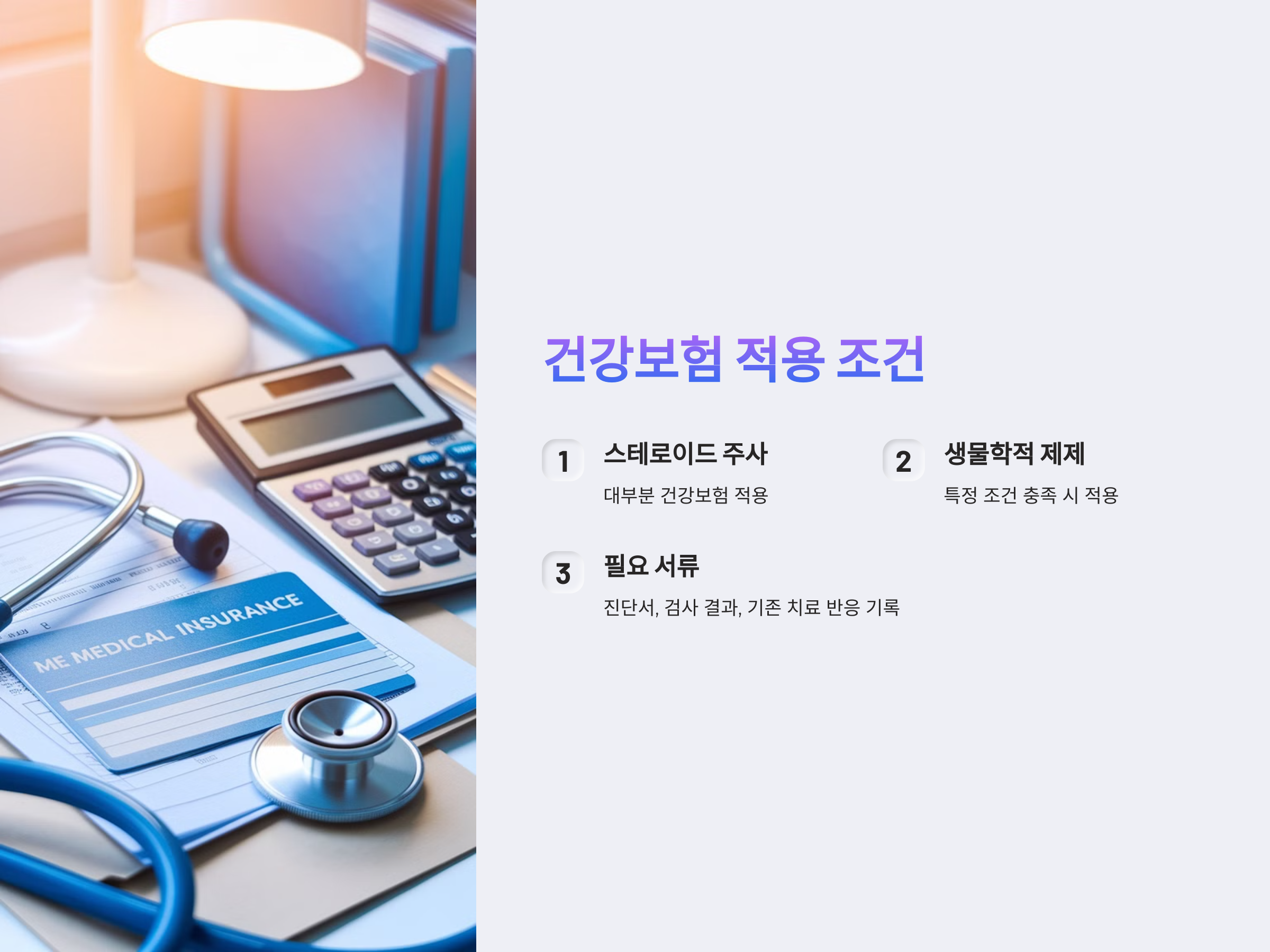 - 생물학적 제제: 조건에 따라 건강보험이 적용되지만, 고액 치료비는 실손보험을 통해 일부 보장될 수 있음.