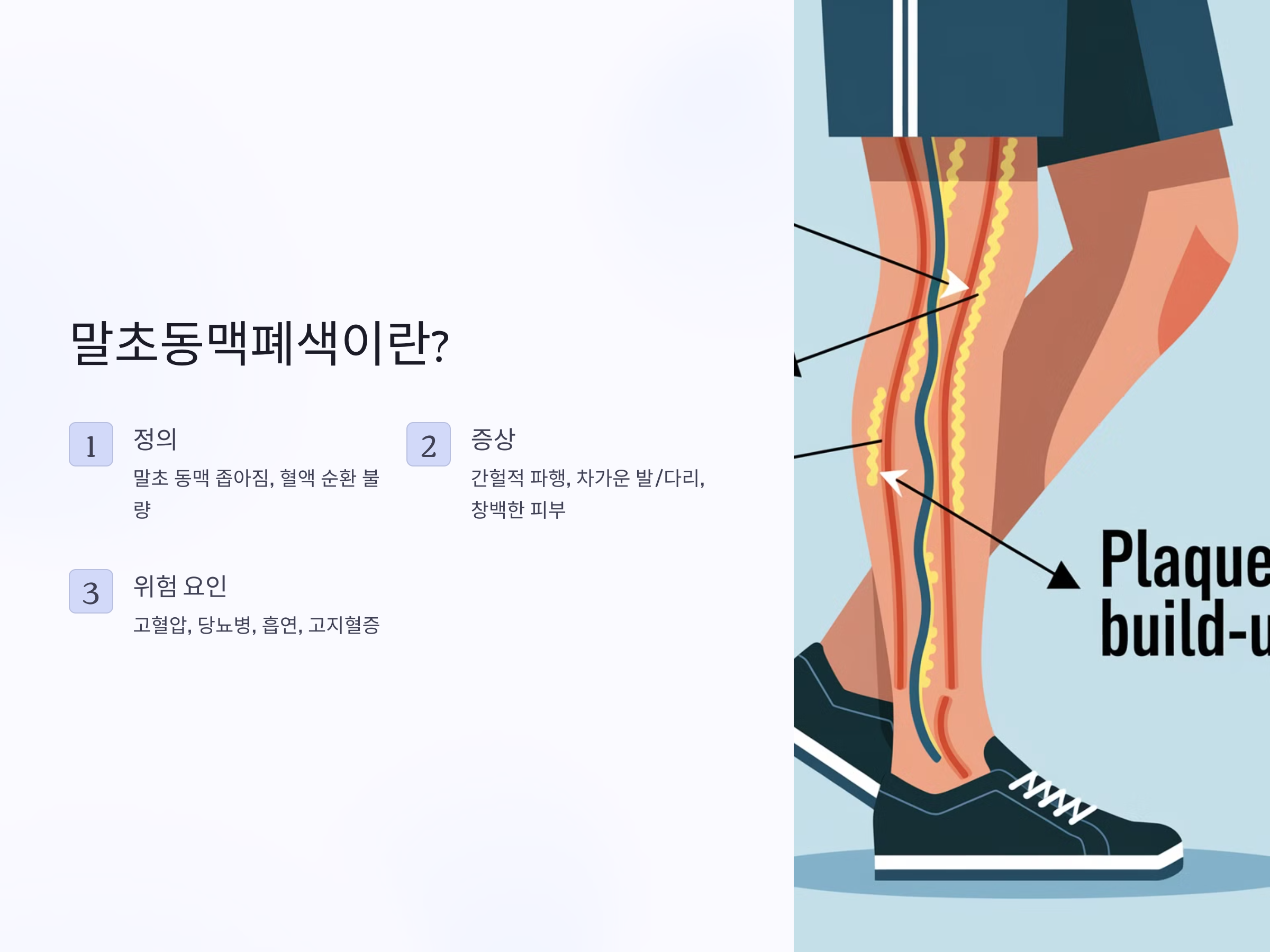 말초동맥폐색은 주로 동맥경화증으로 인해 다리나 팔의 말초 동맥이 좁아지거나 막혀 혈액 순환이 원활하지 않은 상태를 의미합니다. 이로 인해 근육으로 가는 산소와 영양 공급이 부족해지며, 다음과 같은 증상이 발생할 수 있습니다.