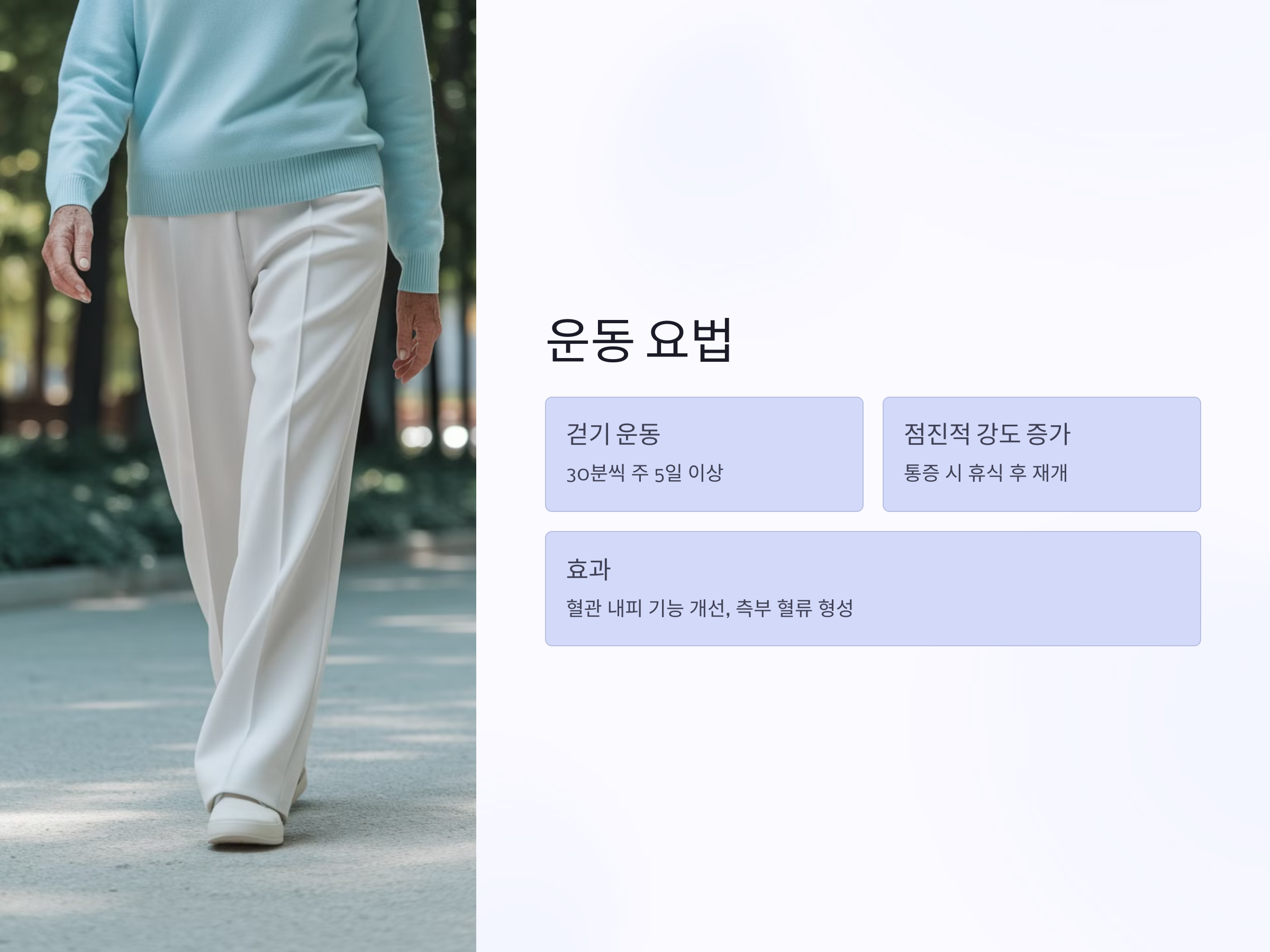 말초동맥폐색 환자에게 운동 요법은 혈류를 개선하고 증상 완화에 중요한 역할을 합니다. 특히 '점진적인 걷기 운동'이 효과적인 관리법으로 꼽힙니다.