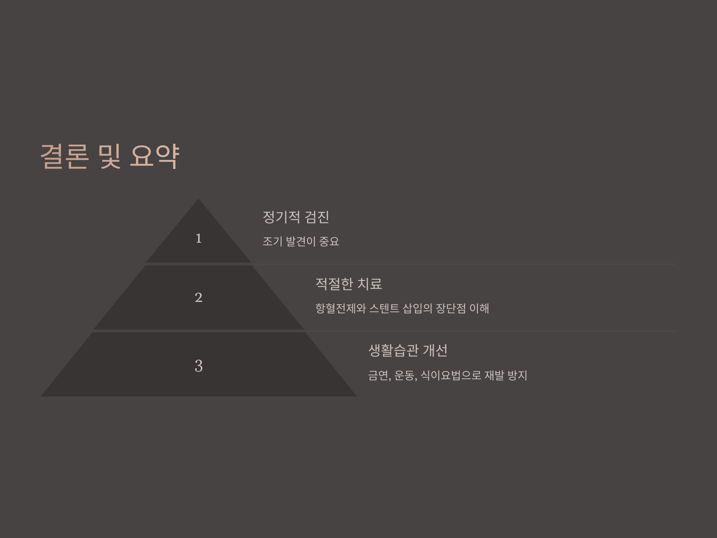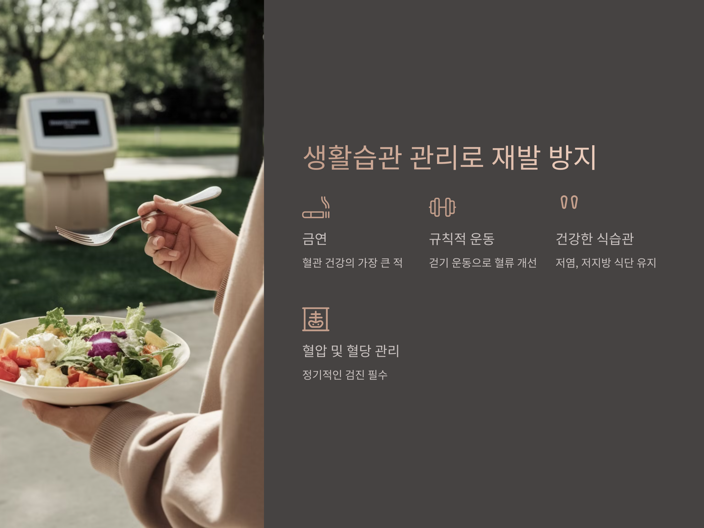 스텐트 시술이나 약물치료를 받았다고 해도 생활습관을 개선하지 않으면 병이 다시 악화될 수 있습니다. 따라서 다음과 같은 관리가 필수적입니다.