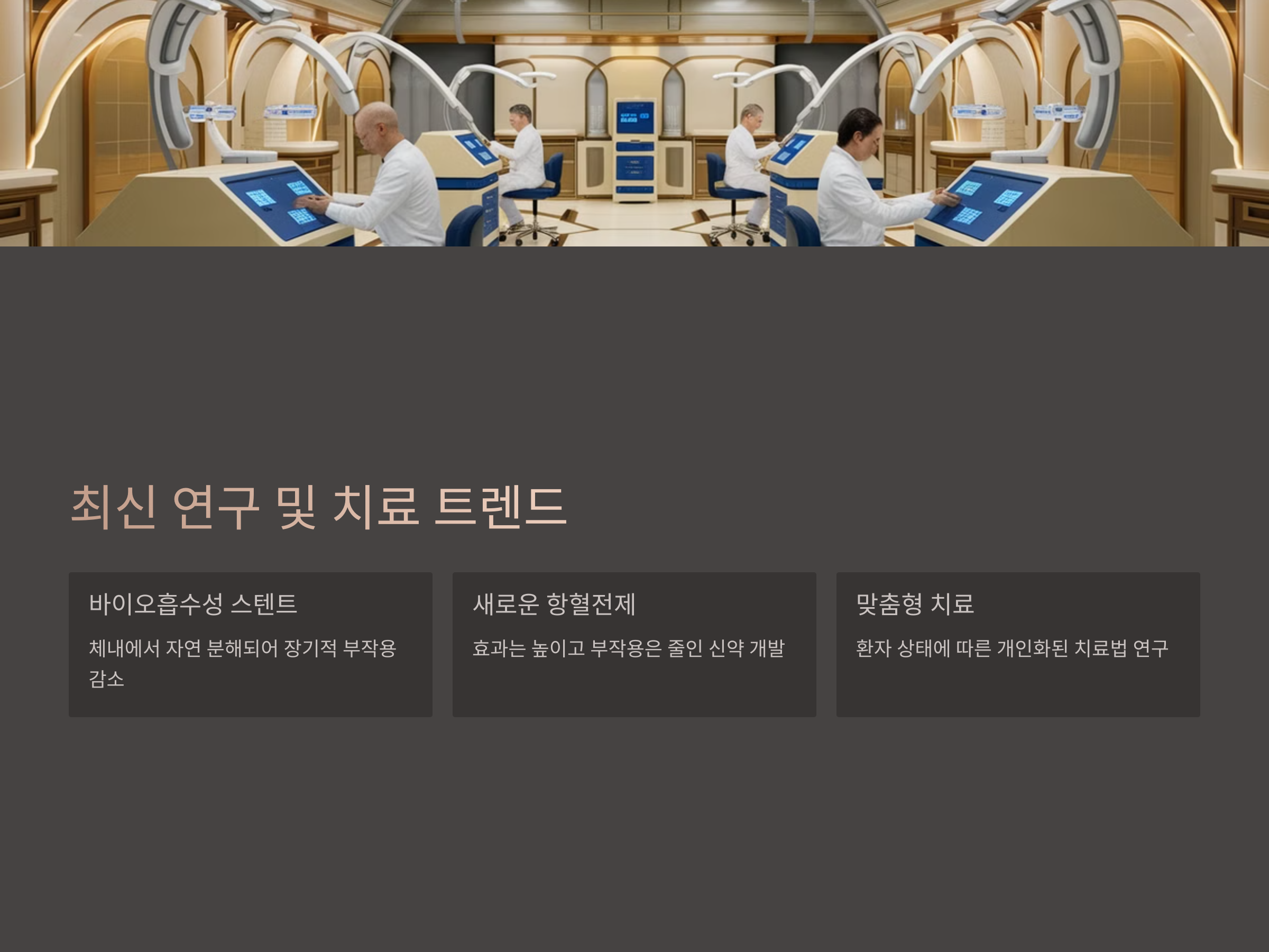 최근 연구에 따르면 새로운 항혈전제와 스텐트 기술이 등장하면서 말초동맥 폐색증 치료의 효과가 향상되고 있습니다. 특히 바이오흡수성 스텐트는 일정 시간이 지나면 체내에서 자연 분해되어 장기적인 부작용을 줄이는 장점이 있습니다.