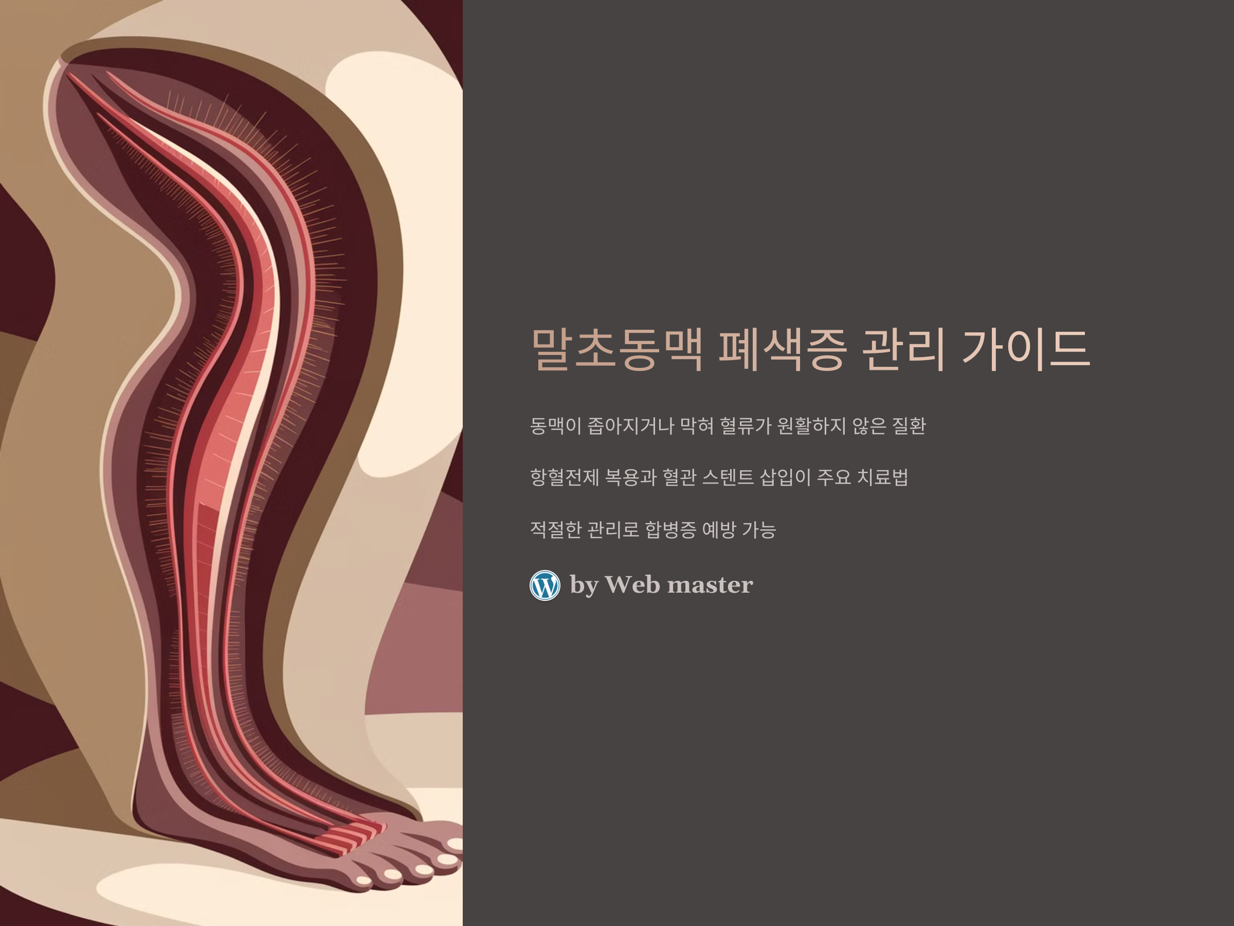 말초동맥 폐색증(Peripheral Artery Disease, PAD)은 주로 다리나 팔과 같은 신체 말단 부위의 동맥이 좁아지거나 막히면서 혈류 공급이 원활하지 않은 상태를 의미합니다. 이 질환은 주로 죽상경화증(동맥경화)에 의해 발생하며, 혈액 내 지방이나 콜레스테롤이 쌓이면서 동맥이 점점 좁아지게 됩니다.