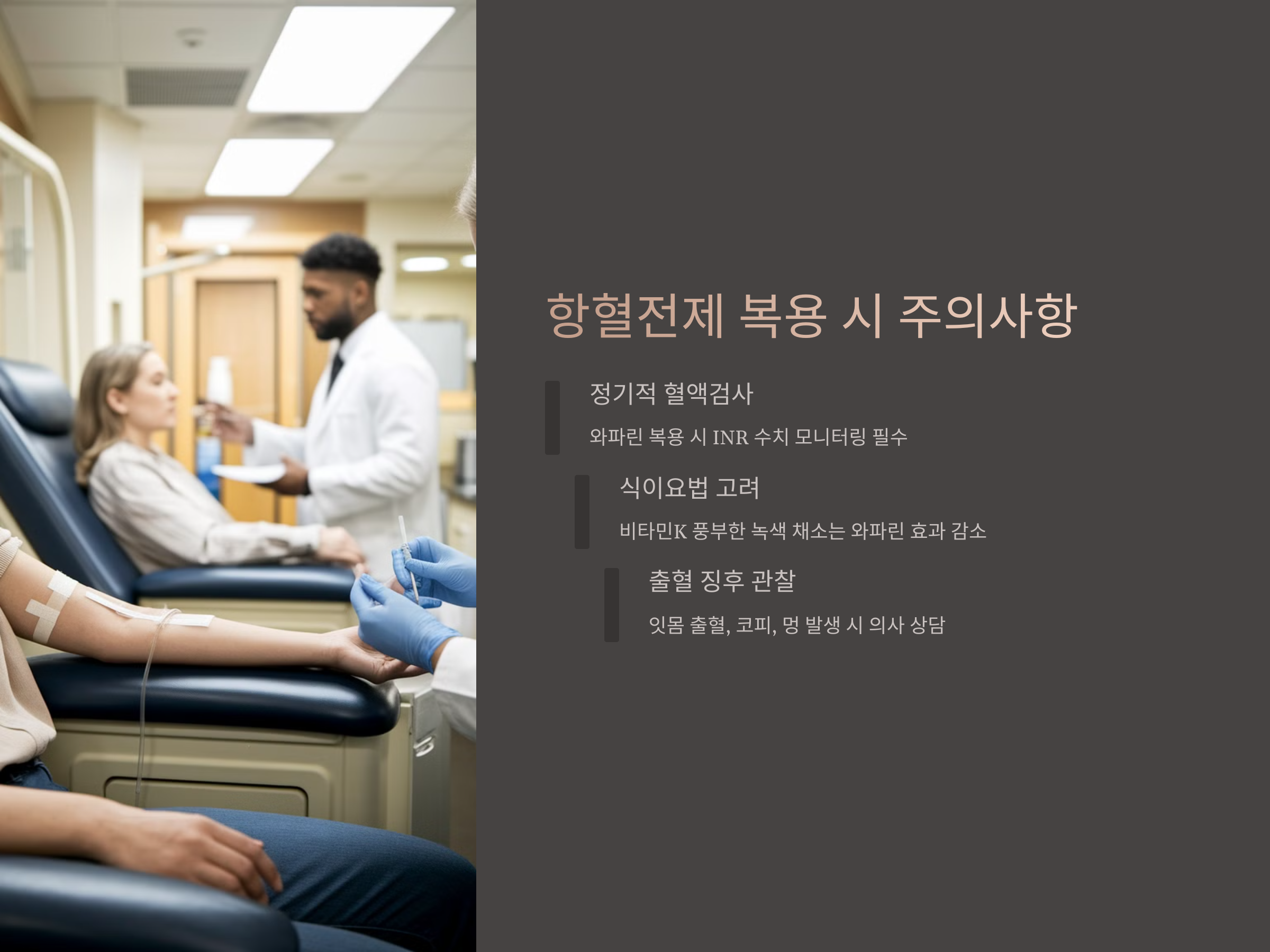 - 정기적인 혈액 검사 필요: 특히 와파린(Warfarin) 복용 시 INR 수치 모니터링 필수