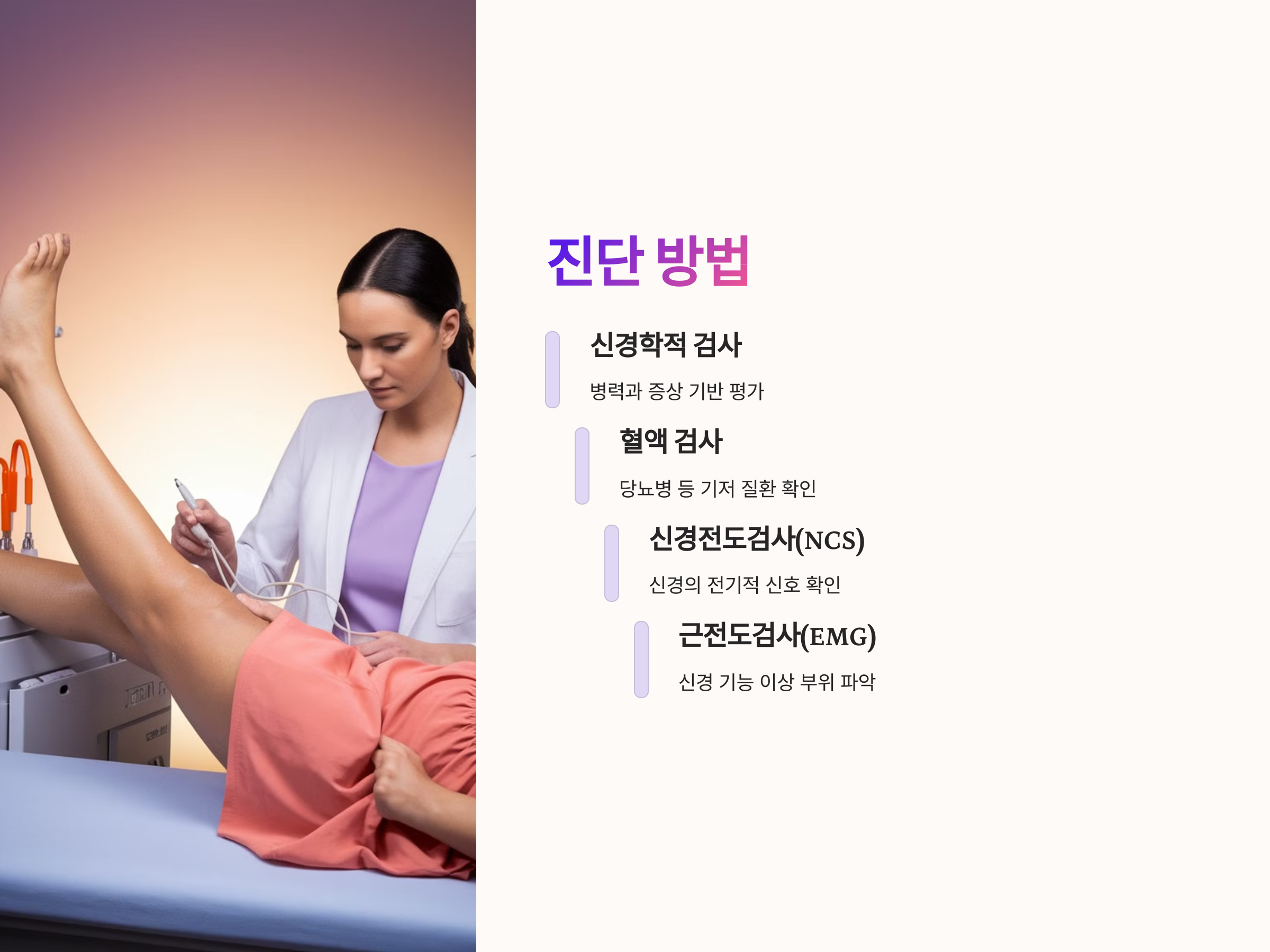 한편, 신경전도검사(NCS)와 근전도검사(EMG)는 신경의 전기적 신호를 확인할 수 있는 중요한 검사 방법입니다. 이 검사를 통해 신경이 정상적으로 작동하지 않는 부분을 파악할 수 있으며, 말초신경병증이 어느 정도 진행되었는지 알 수 있습니다.