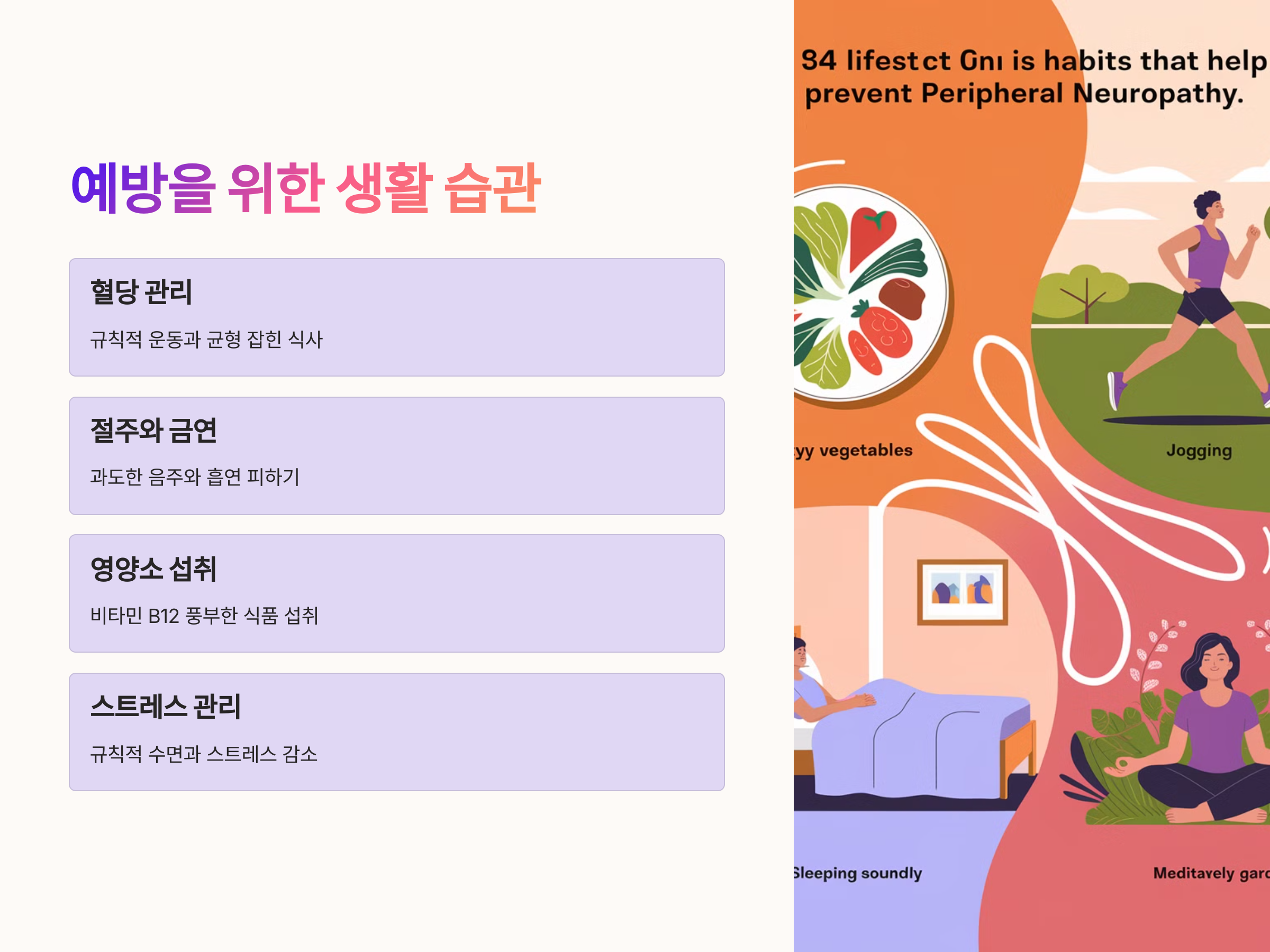 말초신경병증을 예방하려면 몇 가지 생활 습관을 개선하는 것이 중요합니다. 첫째, 당뇨병을 예방하거나 관리하기 위해 혈당을 적절하게 조절해야 합니다. 이는 규칙적인 운동과 균형 잡힌 식사를 통해 이룰 수 있습니다. 또한, 과도한 음주를 피하고, 흡연을 줄이는 것이 신경 건강에 큰 도움이 됩니다.