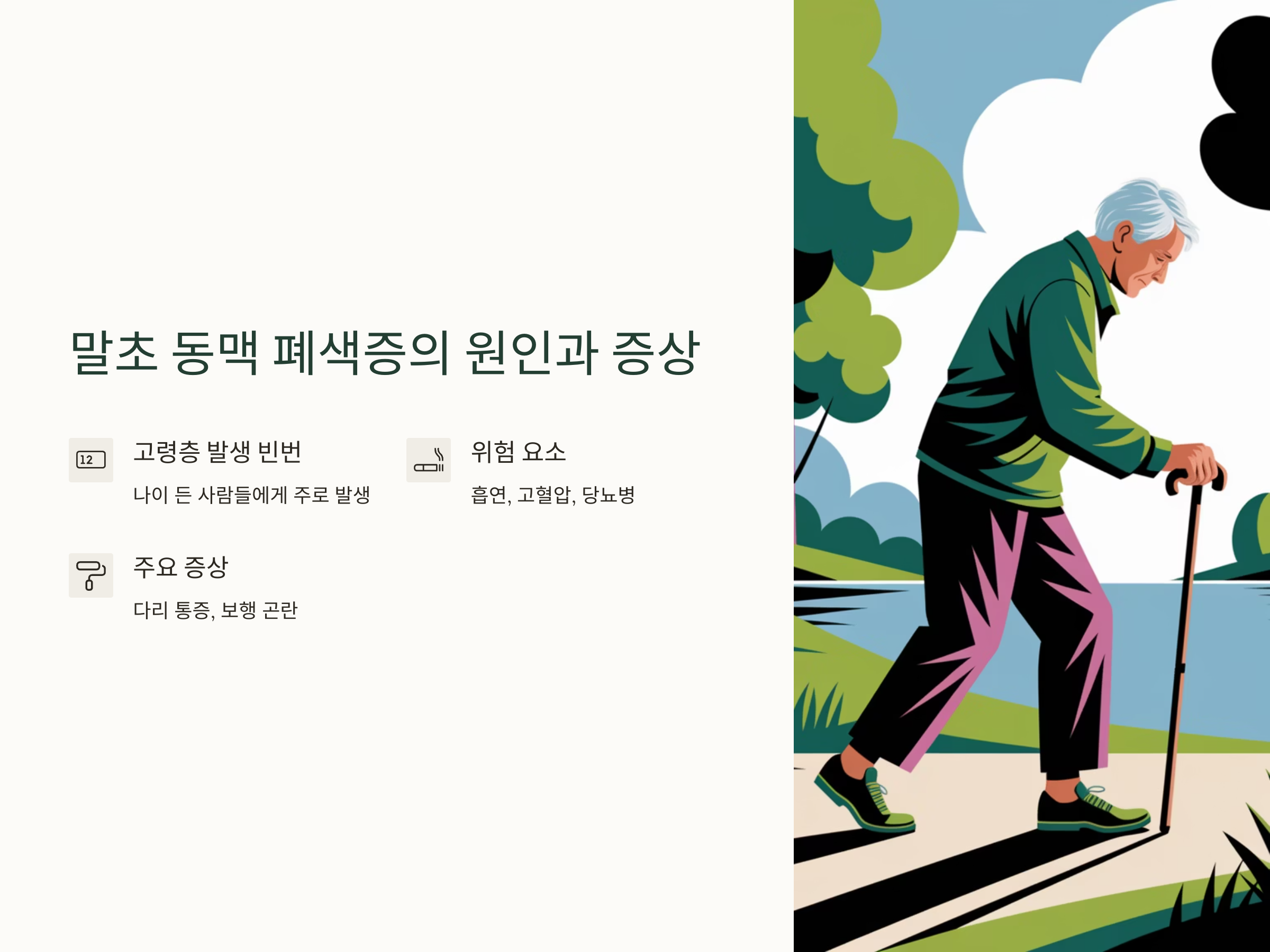말초 동맥 폐색증은 주로 나이 든 사람들에게 발생하지만, 흡연, 고혈압, 당뇨병과 같은 위험 요소를 가진 사람에게 더 자주 발생합니다. 이 질환은 시간이 지날수록 혈관이 점차적으로 좁아져 혈류가 제한되기 때문에 초기에는 증상이 미미할 수 있습니다. 그러나 증상이 진행되면 다리에 통증을 느끼거나, 심한 경우 걷는 것이 어려워질 수 있습니다.