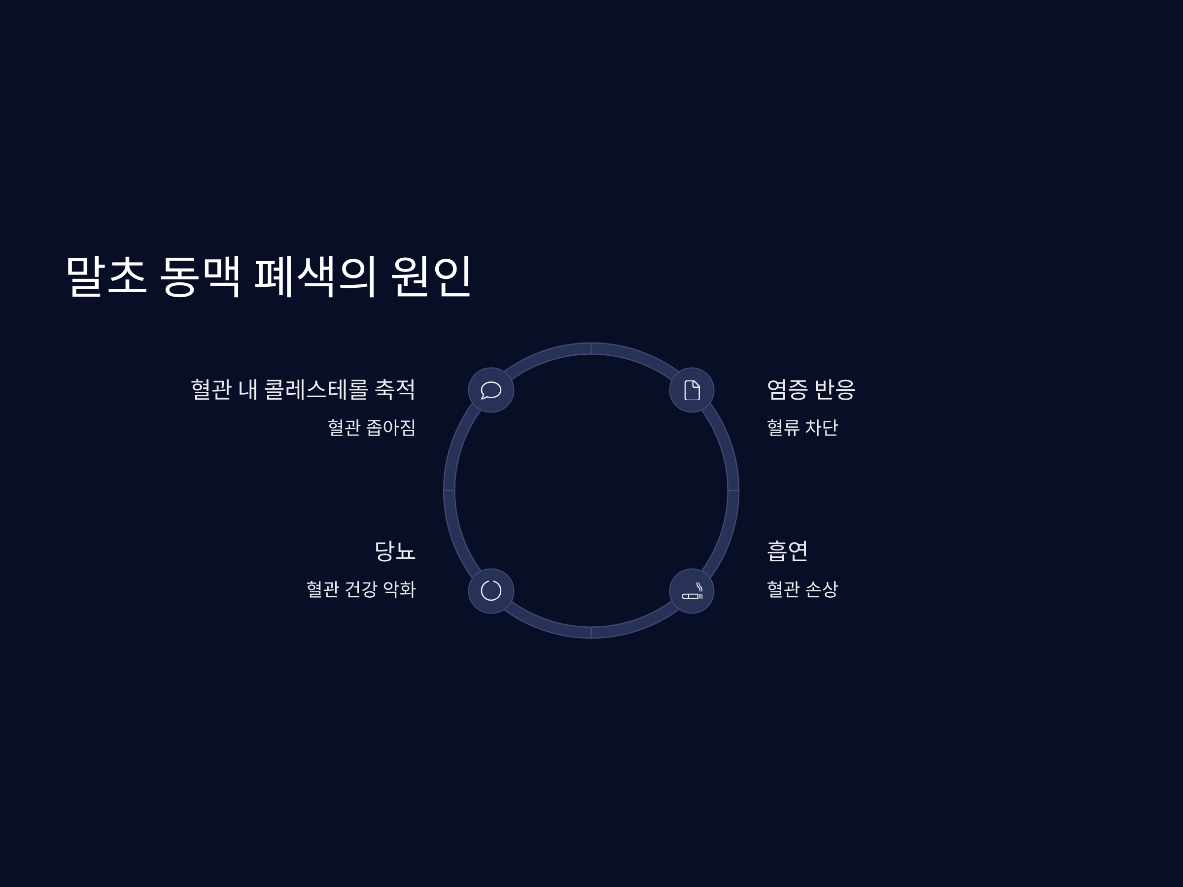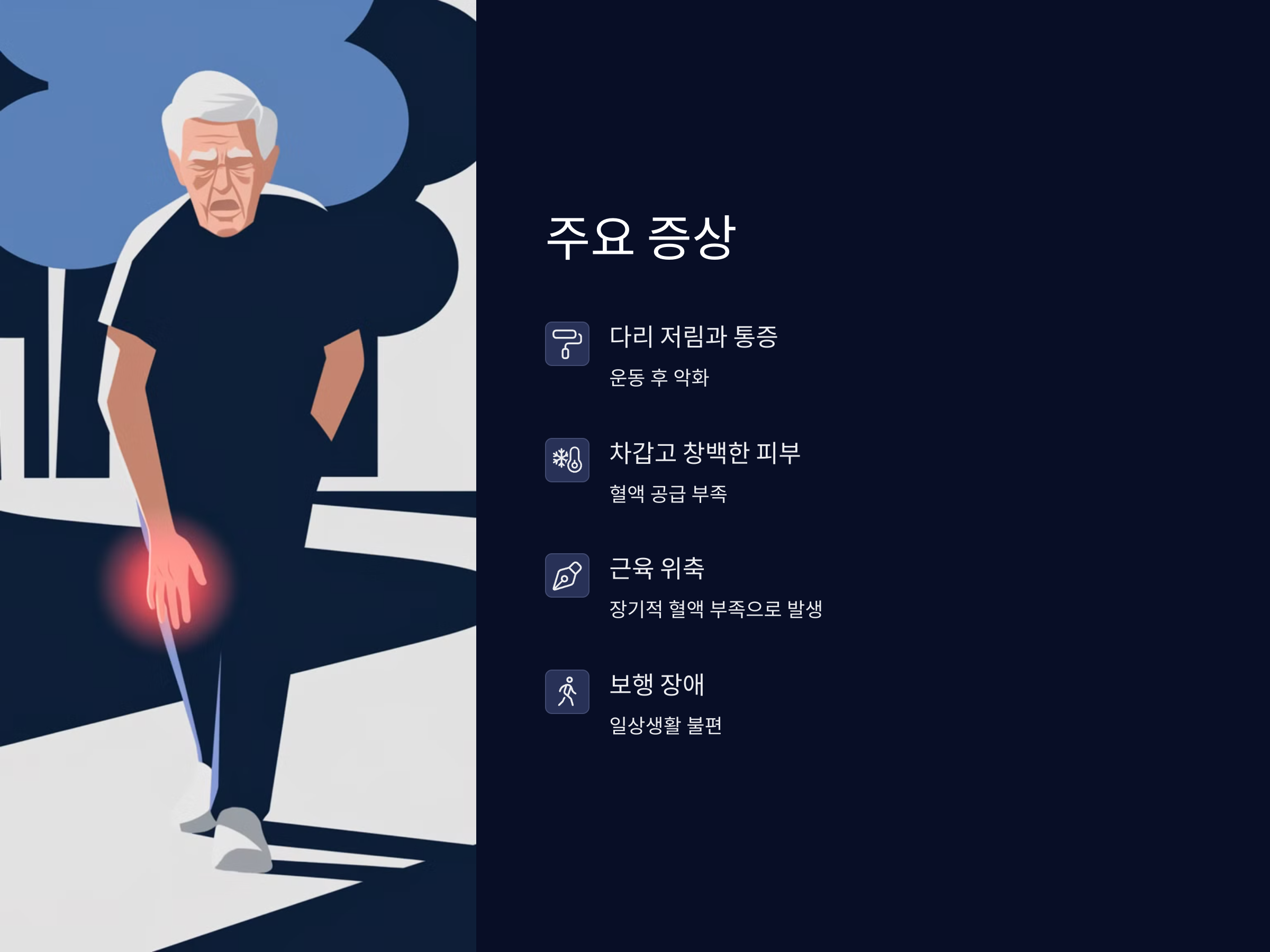 말초 동맥 폐색의 주요 원인은 혈관 내에 콜레스테롤이나 다른 물질이 쌓여 혈관을 좁히거나 차단하는 것입니다. 이로 인해 다리로 가는 혈액이 부족해져 다양한 증상이 발생할 수 있습니다. 주요 증상은 다리 저림, 통증, 특히 운동 후 통증이 악화되는 경향이 있습니다. 이 외에도 다리 피부가 차고 창백해지거나, 심한 경우 근육 위축이 나타나기도 합니다.