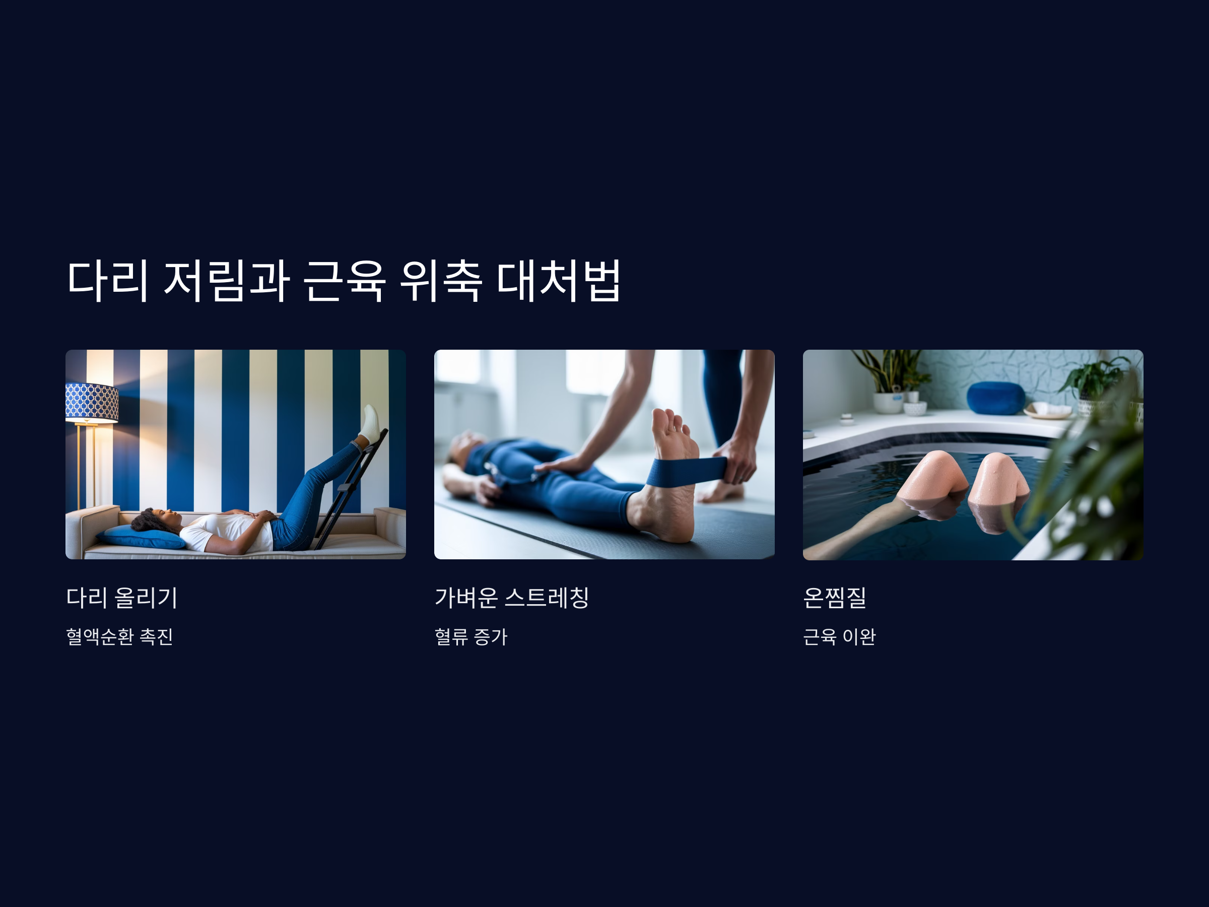 다리 저림과 근육 위축이 발생하면, 우선 혈액순환을 촉진하는 방법을 시도해야 합니다. 쉬는 동안 다리를 올려주거나, 가벼운 스트레칭 운동을 통해 혈류를 증가시킬 수 있습니다. 또한, 따뜻한 목욕이나 온찜질을 통해 근육을 이완시키는 것도 도움이 될 수 있습니다.