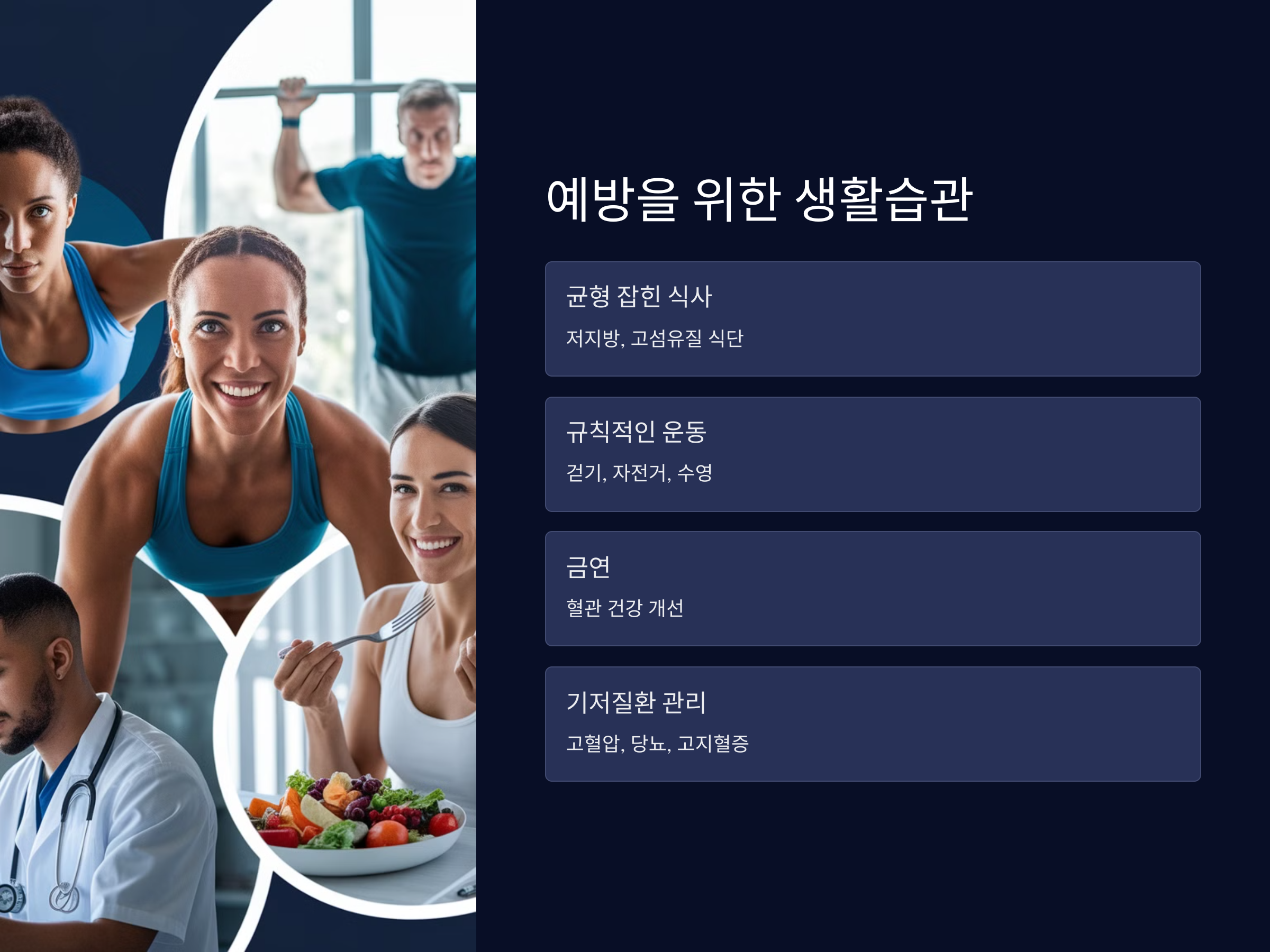 말초 동맥 폐색은 예방이 가능한 질환입니다. 가장 중요한 것은 건강한 생활습관을 유지하는 것입니다. 균형 잡힌 식사를 하고, 규칙적으로 운동을 하며, 담배를 피우지 않는 것이 기본적인 예방 수칙입니다. 고혈압, 당뇨병, 고지혈증과 같은 질환을 관리하는 것도 매우 중요합니다.