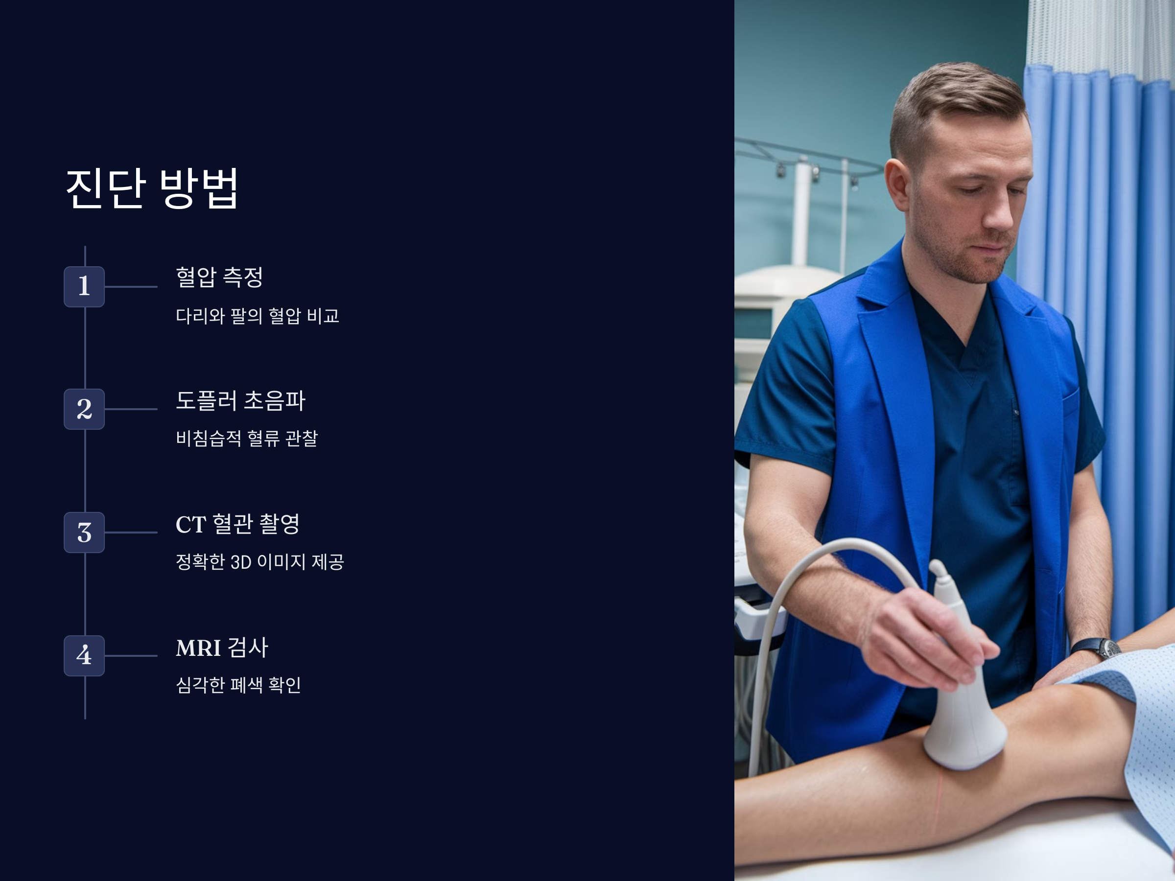 말초 동맥 폐색은 초기에는 별다른 증상을 보이지 않기도 해서 조기 발견이 중요합니다. 다리 저림이나 통증이 지속되거나, 운동 후 증상이 악화된다면 반드시 병원을 찾아야 합니다. 주요 진단 방법으로는 혈압 측정, 다리의 혈류를 평가하는 도플러 초음파 검사, 그리고 필요에 따라 CT 혈관 촬영이나 MRI 검사를 통해 혈관 상태를 파악할 수 있습니다.