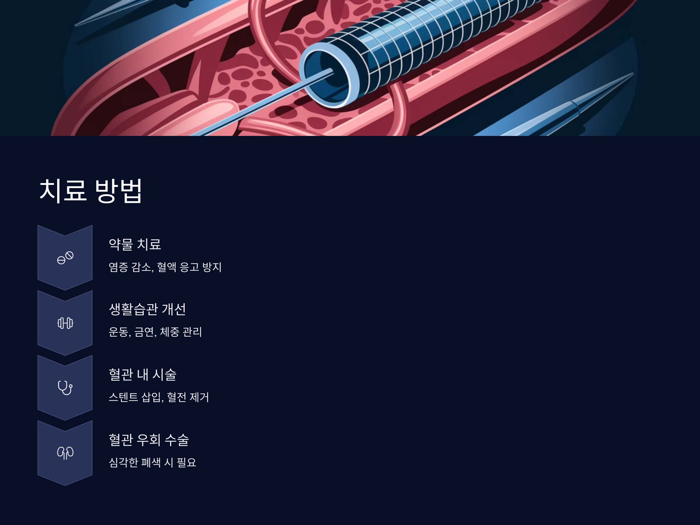 약물 치료는 동맥의 염증을 줄이고, 혈액이 응고되지 않도록 하는 약물들이 사용됩니다. 통증이 심해지거나 혈류가 심각하게 차단될 경우, 혈관 우회 수술이나 혈관 내 시술이 필요할 수 있습니다. 혈관에 스텐트를 삽입하거나, 혈전을 제거하는 시술이 일반적으로 이루어집니다.