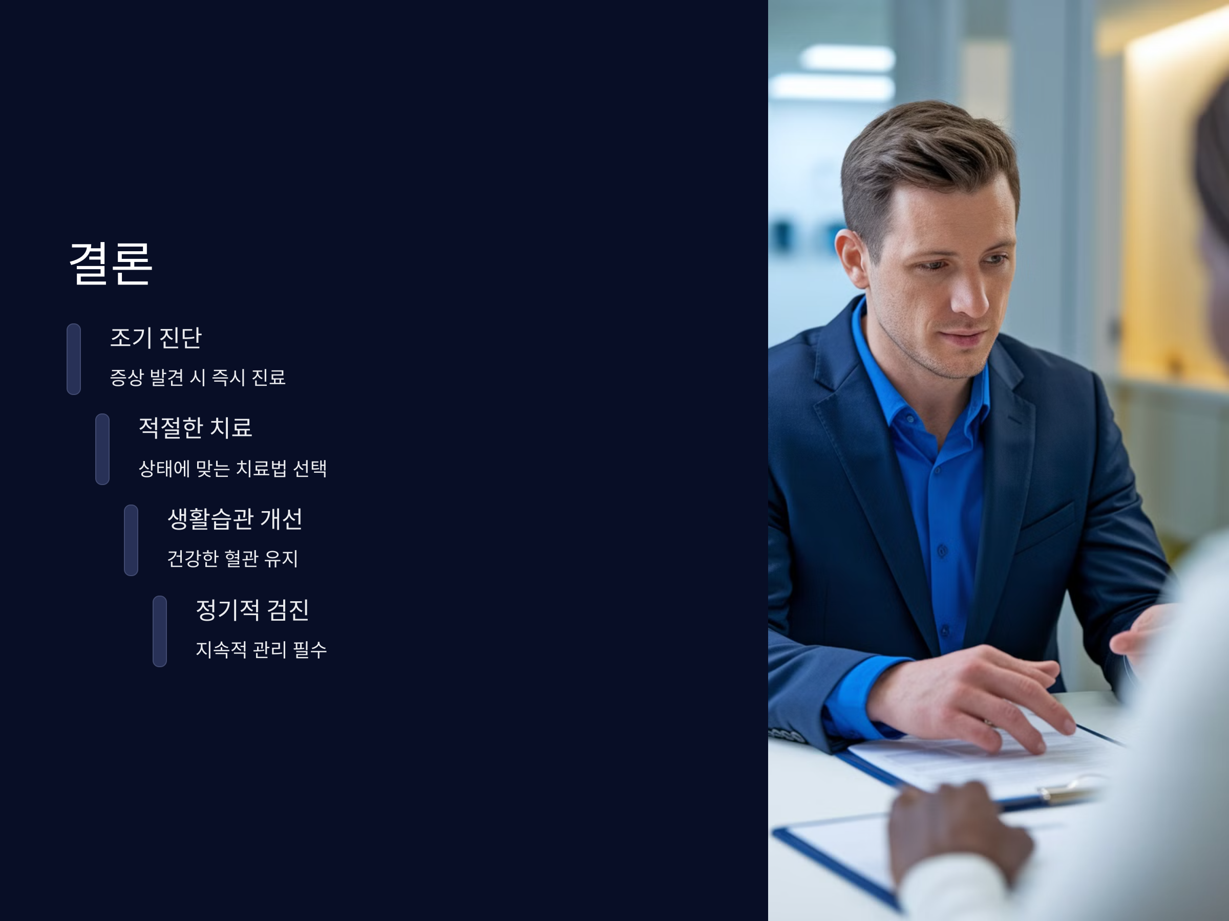 말초 동맥 폐색은 다리 저림과 근육 위축의 원인 중 하나로, 증상이 나타나면 즉시 치료를 시작하는 것이 중요합니다. 생활습관 개선과 조기 진단을 통해 많은 경우 예방할 수 있으며, 치료 또한 다양하게 선택할 수 있습니다. 혈액순환을 돕고 건강한 동맥을 유지하는 방법을 실천하는 것이 핵심입니다. 정기적인 검진과 적절한 치료를 통해 말초 동맥 폐색을 예방하고 관리할 수 있습니다.