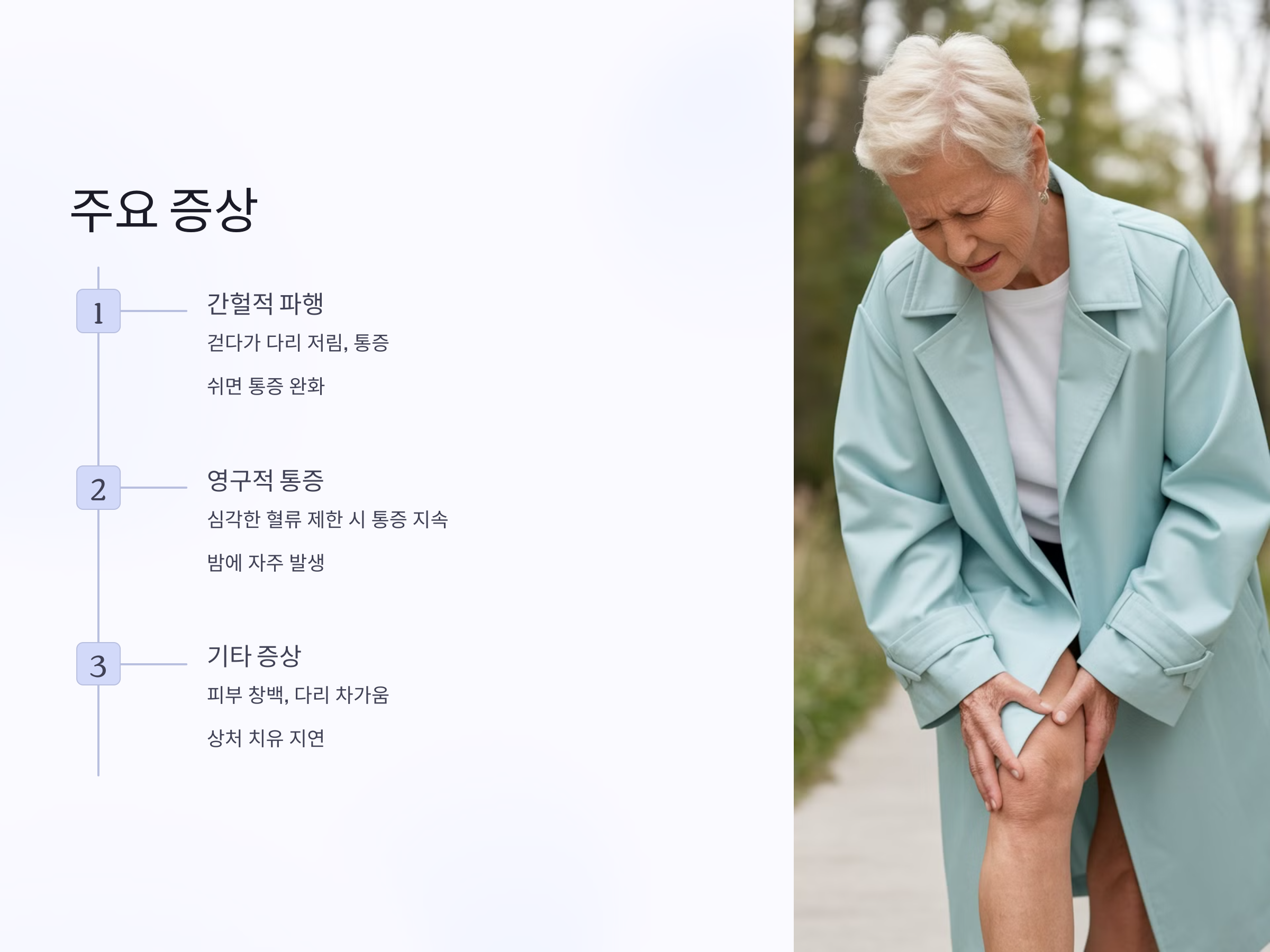 - 간헐적 파행: 걷다가 다리가 저리고 아프기 시작하는 증상으로, 잠시 멈추고 쉬면 통증이 완화됩니다.