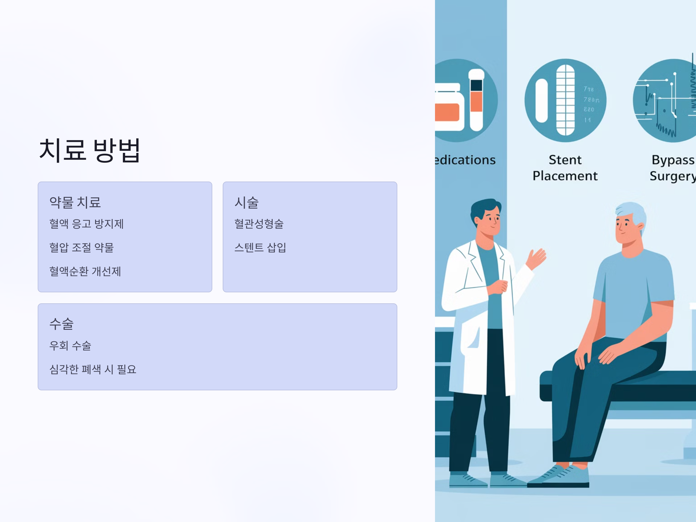 2. 시술 및 수술: 만약 약물 치료로 효과가 없거나 혈관이 심각하게 좁아지면, 스텐트 삽입이나 우회 수술 등의 방법이 필요할 수 있습니다.