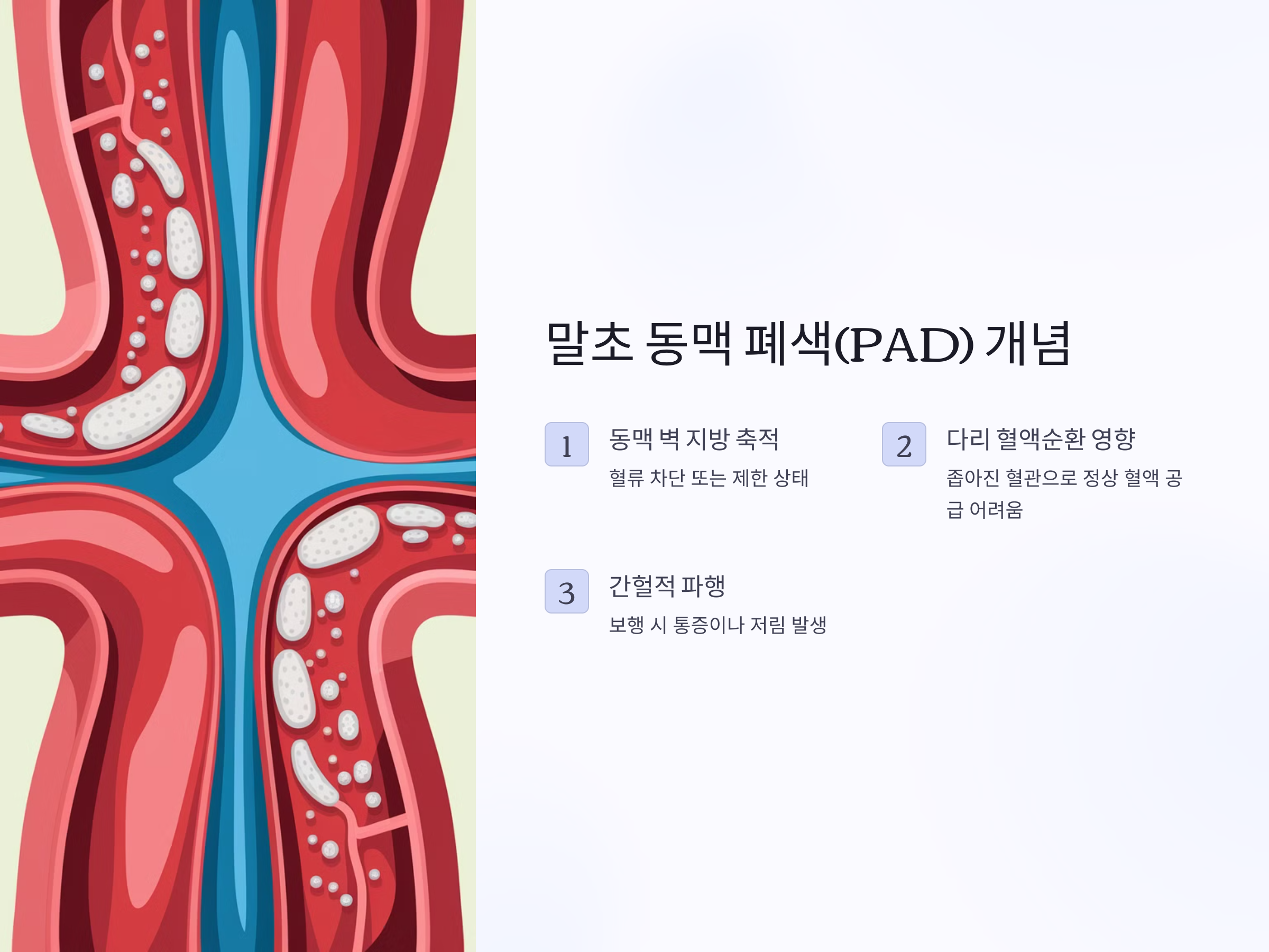말초 동맥 폐색은 동맥 벽에 지방이 축적되어 혈류가 차단되거나 제한되는 상태입니다. 이는 주로 다리의 혈액순환에 영향을 미치며, 좁아진 혈관으로 인해 정상적인 혈액 공급이 어려워집니다. 이러한 상태가 지속되면 보행 시 통증이나 저림을 느끼게 되며, 이는 보통 "간헐적 파행"이라고 불립니다. 초기에는 걷다가 잠시 쉬면 증상이 사라지기도 하지만, 점차 심해지면 통증이 지속되고 일상적인 활동이 어려워질 수 있습니다.